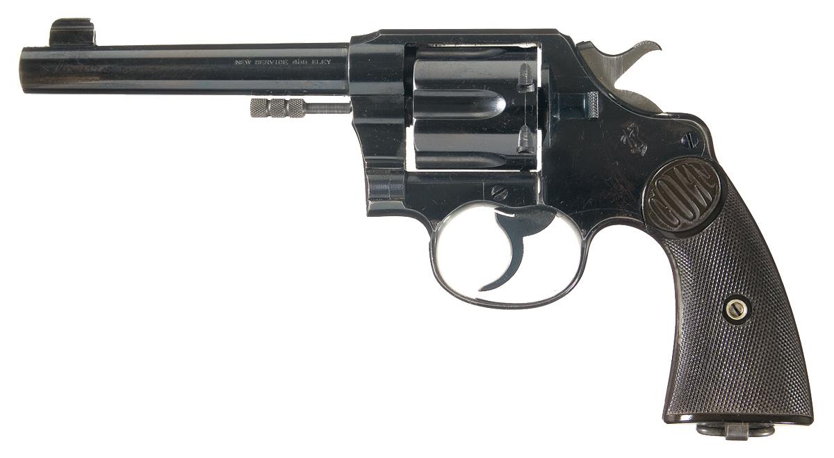 Manufactured in 1914. Replacement Marble's blade front and notch rear sights, the barrel has the standard two line address/ 1884, 1900 and 1905 patent dates on top and is marked "NEW SERVICE 455 ELEY" on the left side. The frame is marked with the Rampant Colt, Verified Proof, and "3" inspector's mark on the left side, with a checkered hammer with polished sides and smooth trigger. The front sight is a period replaced target front sight. Fitted with checkered grips with "COLT" in an oval at the top and a lanyard swivel on the butt. The right grip panel is marked "63635".