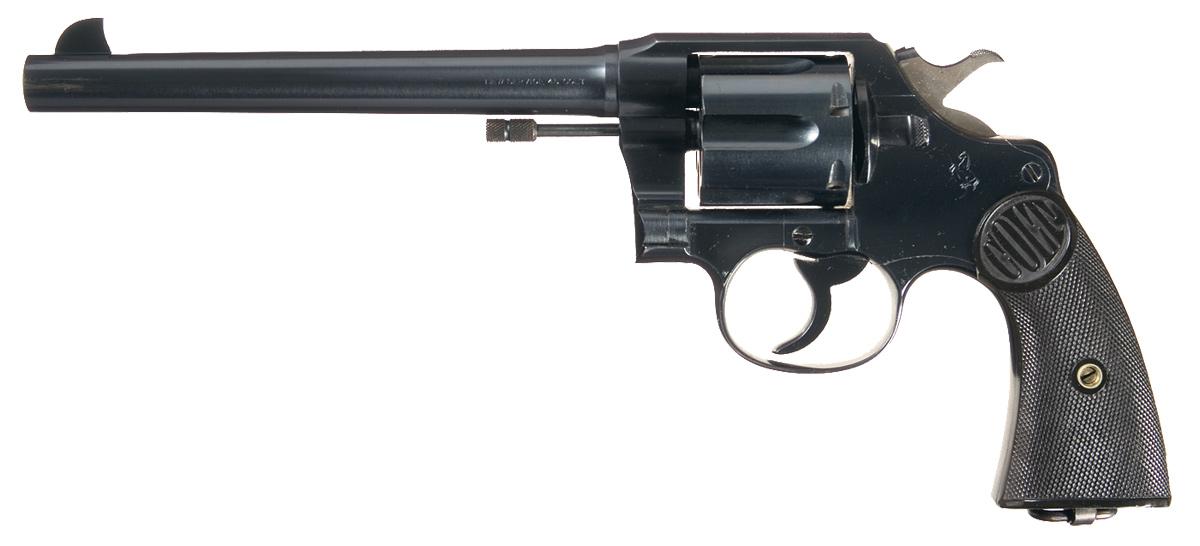 Manufactured in 1920, the top of the barrel is marked with the two line address/1884, 1900 and 1905 patent dates and the left side is marked "NEW SERVICE 45 COLT". Blade front and frame notch rear sights and fitted with checkered hard rubber grips with "COLT" in an oval at the top and lanyard ring on the butt.