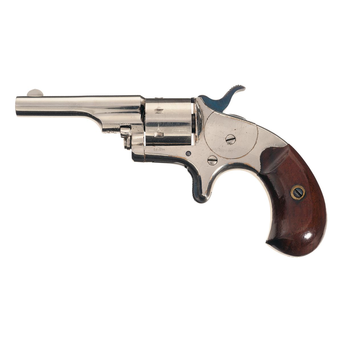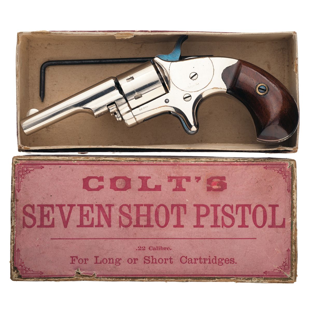 Made in 1875. Fixed sights, with the two line address, flanked by crosses on the barrel and "22 CAL" on the let side of the frame. Matching numbers on the barrel and butt, with checkered hammer and trigger and smooth birds head grips. With a Colt box, labeled for a "SEVEN SHOT PISTOL", "NICKEL PLATED.", and a combination screwdriver and cleaning rod.