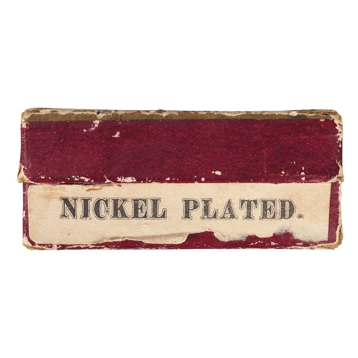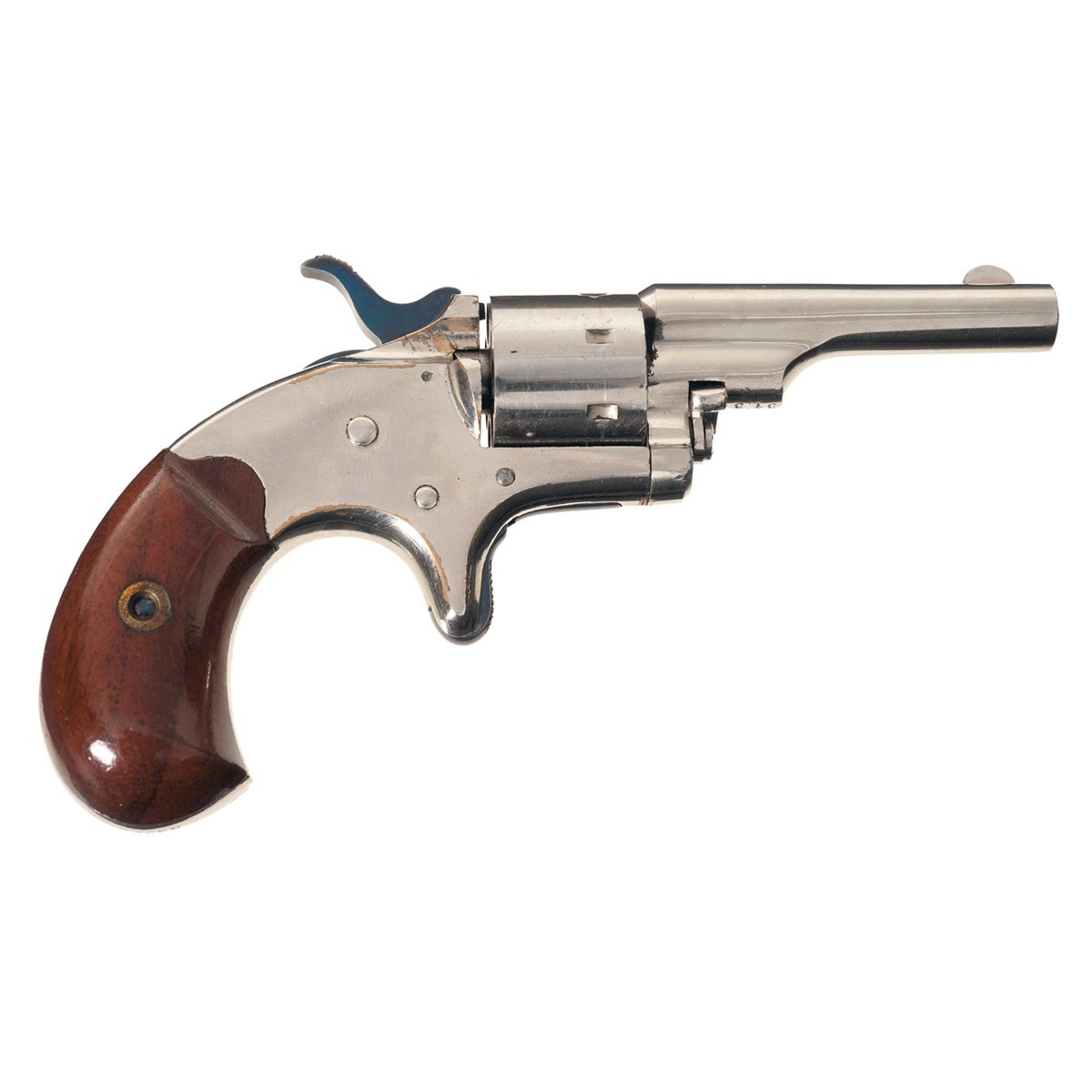 Condition: Excellent, with 97% of the original nickel finish, showing wear along the edges and scattered handling marks. Some dents are visible near the barrel wedge and on the underside of the frame, with a pin absent from the frame. The hammer and trigger show a bright niter blue finish. Grips are very fine, with some varnish loss on bottom edge. Box is good, numbered to another gun, with some tears, edge wear and material loss. Mechanically very good.