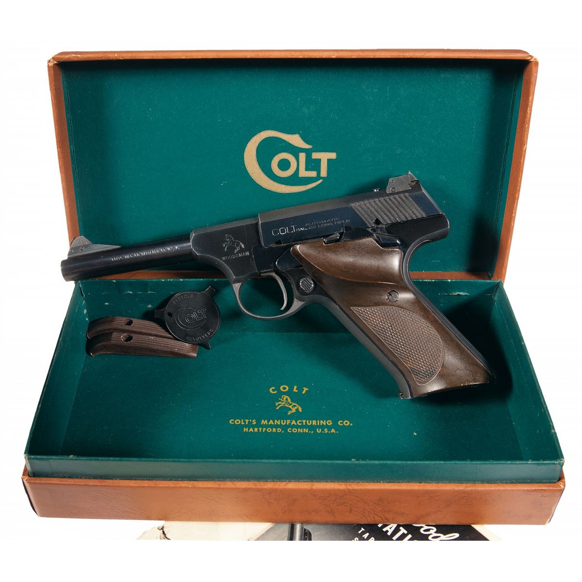 Manufactured in 1952. The left side of the barrel is marked with the one line address, The Rampant Colt over "WOODSMAN" on left side of the frame, serial number on the opposite side and the "COLT" caliber marking on left side of the slide. Ramped front blade and adjustable rear target sights, smooth trigger, blue Colt marked magazine and fitted with checkered plastic grips with right hand thumb rest. Complete with a Colt hinged lid brown box with test target, two grip adaptors and Colt screwdriver tool.