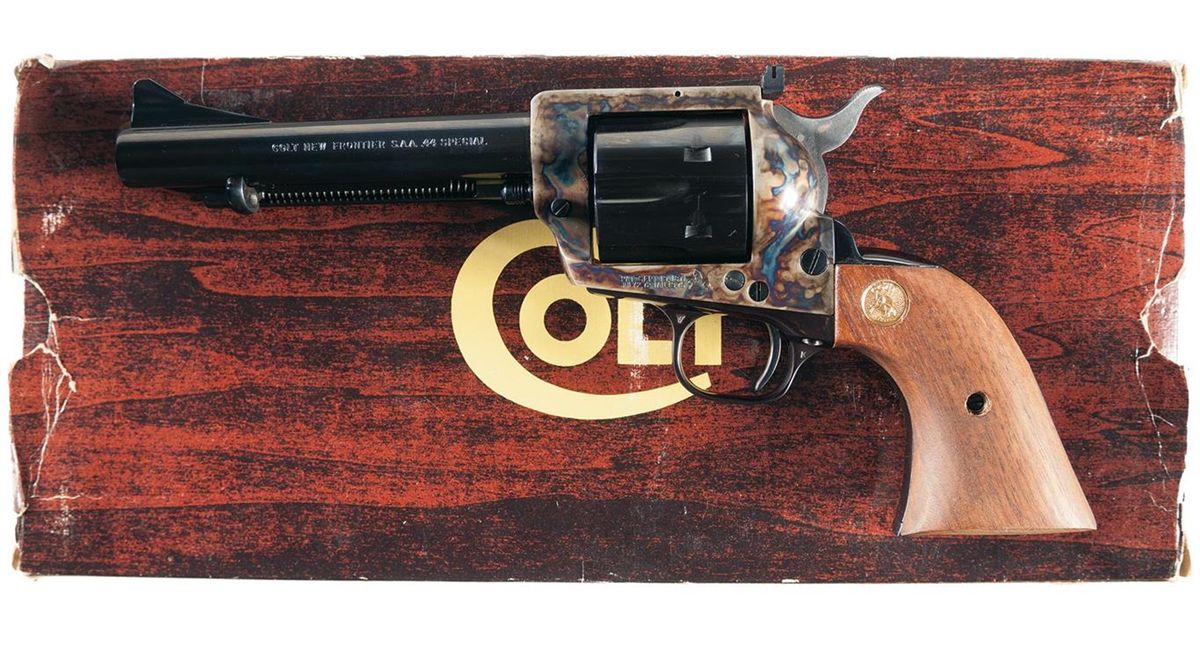 Manufactured in 1980. This revolver is fitted with the rarely found 5 1/2 inch barrel, (7 1/2 inch was standard). The top of the barrel is marked with the one line address, the left side is marked "COLT NEW FRONTIER SAA 44 SPECIAL" and the left side of the frame is marked with the two line, three patent dates followed by the Rampant Colt. Ramped front and adjustable rear sights, blue finish with casehardened frame and fitted with smooth walnut grips with gold Colt medallions. Complete with the original "woodgrain" box with styrofoam insert numbered to the gun.