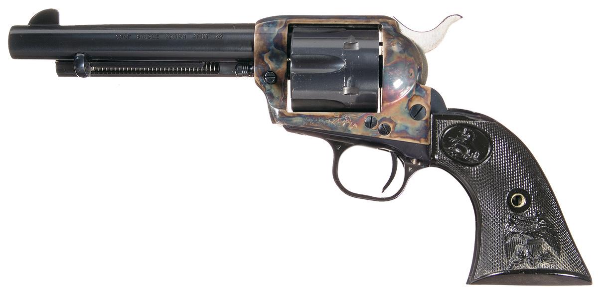 Condition: Excellent, with 98% of the original blue finish, showing a few light handling marks overall and minor scratches on the cylinder. Case colors are bright and vivid with all remaining. Grips are excellent, with minimal wear and crisp checkering. Mechanically excellent.