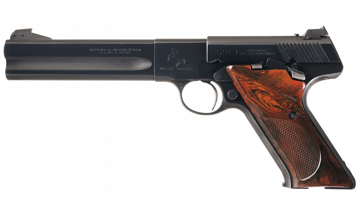 Manufactured in early 1949, the second year of production for the Second Series Woodsmans. The two-line address/patent information is marked on the left side of the barrel, the Rampant Colt over "MATCH TARGET" on the left side of the frame, with the serial number on the opposite, and the left side of the slide is marked "COLT" followed by the two line caliber designation. Ramped blade front and adjustable rear target sights, serrated trigger and grip straps, blue Colt marked early Second Series magazine and fitted with checkered plastic grips with the Rampant Colt molded at the top of the right panel.