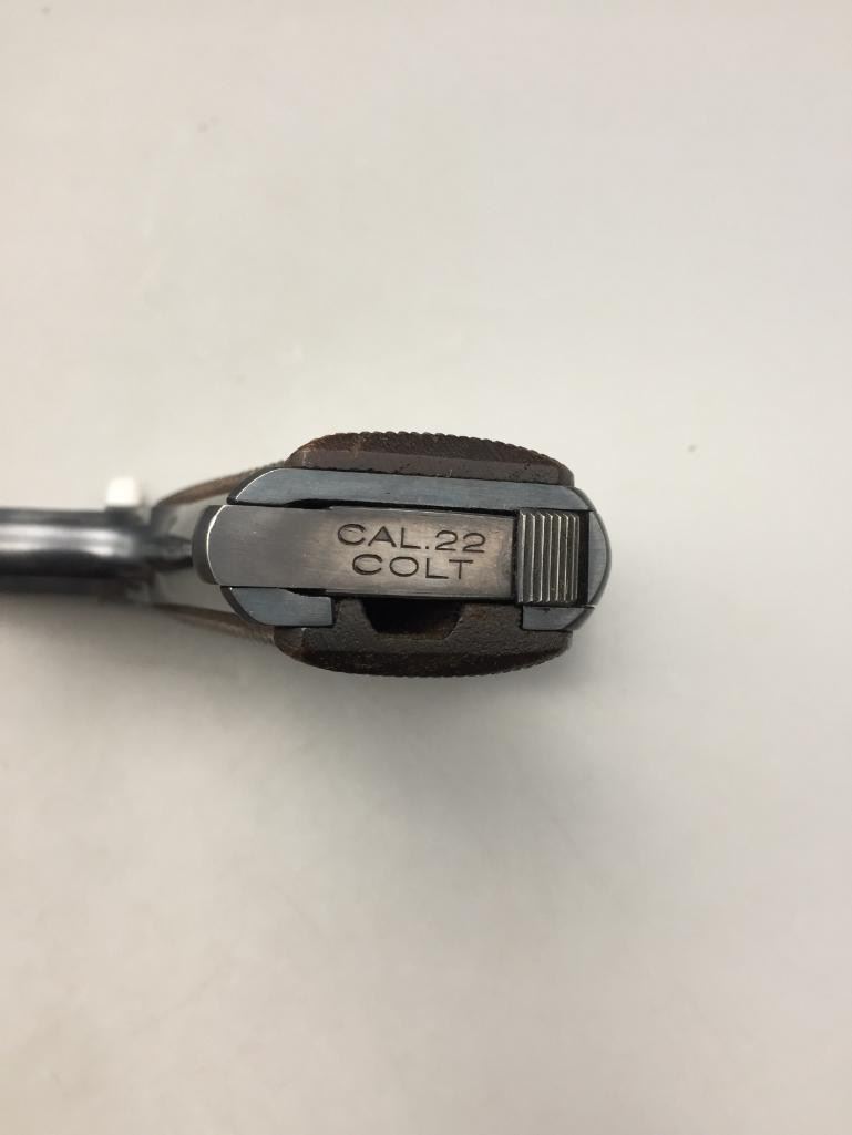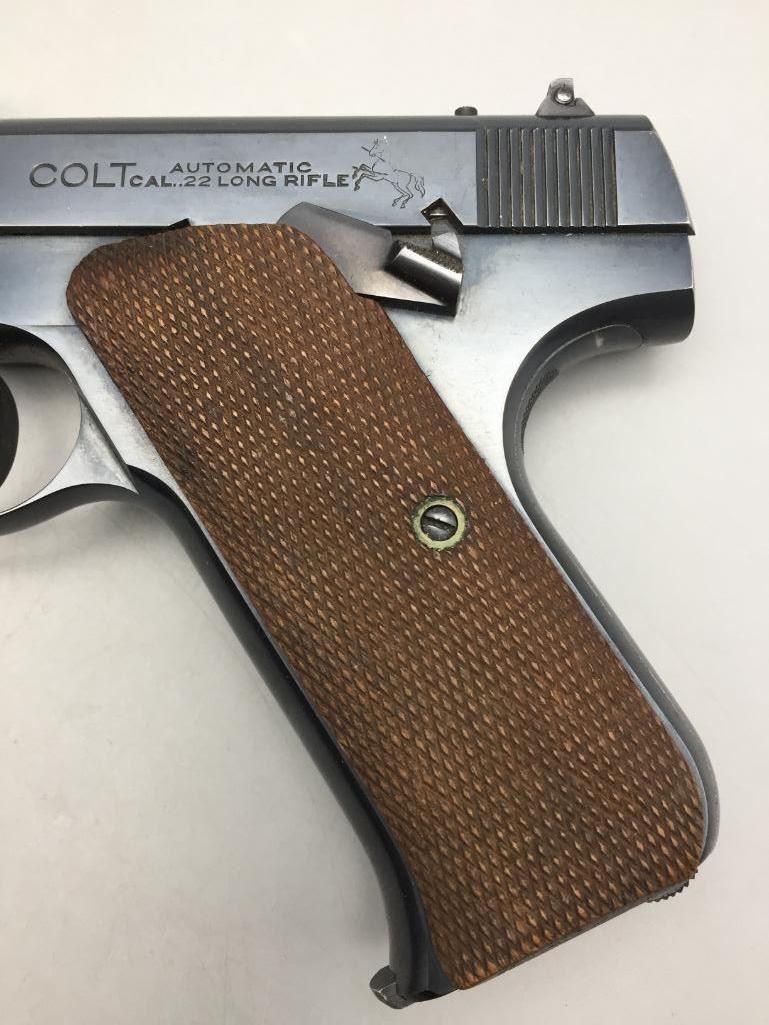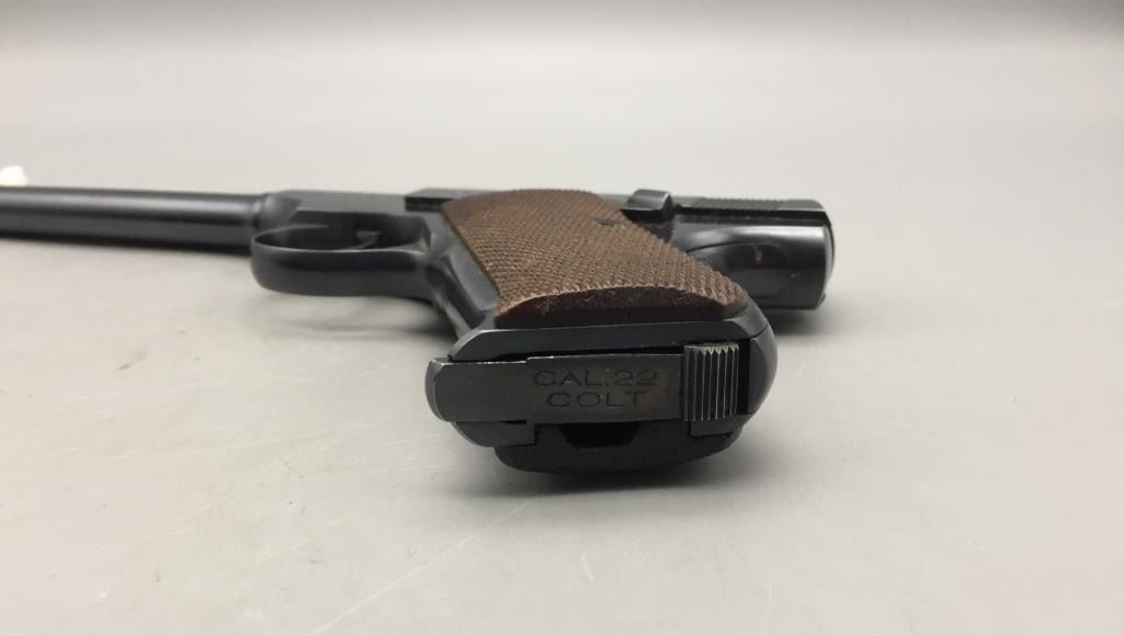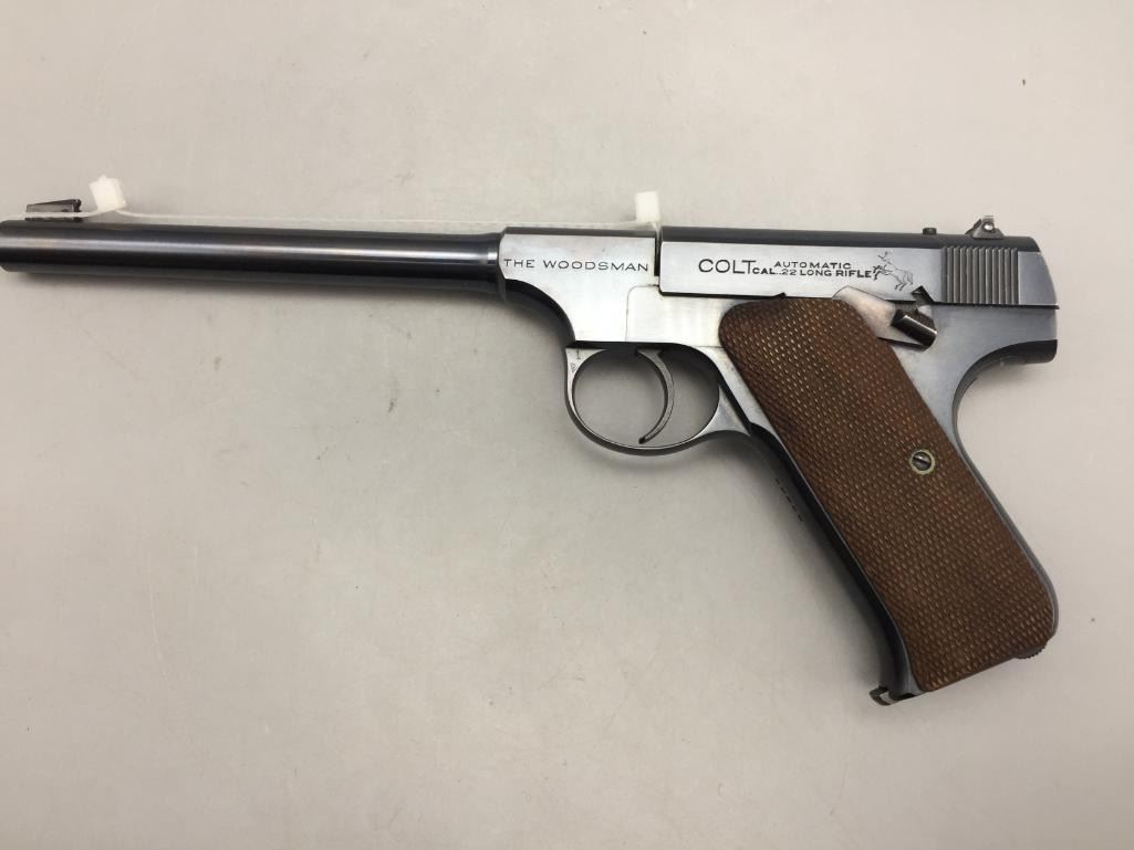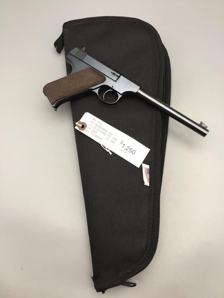 Presented for your consideration is this Colt Woodsman in very good (almost like new) condition for its age. It is .22 long rifle caliber with checkered wood grips and a 6 5/8 inch barrel. It will come with the pistol case pictured. Maker: Colt. Serial No. 68800. Size: Barrel measures 6-5/8 inches. Age: Circa 1929. Please look closely at the pictures - they are an important part of our description. Shipping: There will be a $15 handling / packaging fee for shipping this lot. The actual cost of postage will be added on top of that. *****This firearm requires an FFL Transfer*****