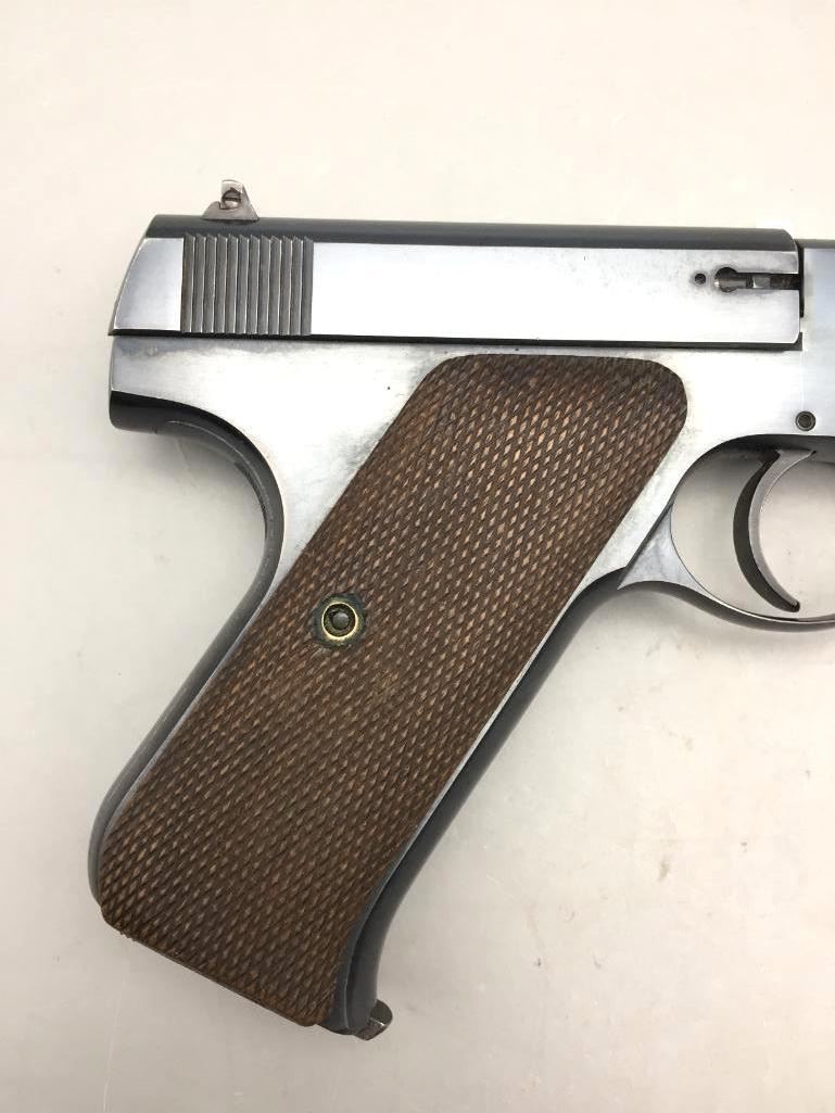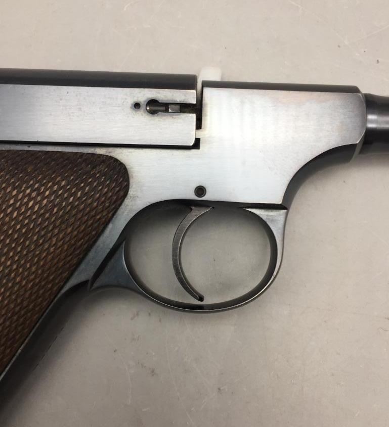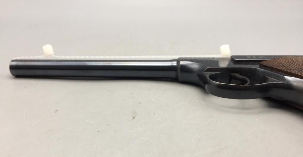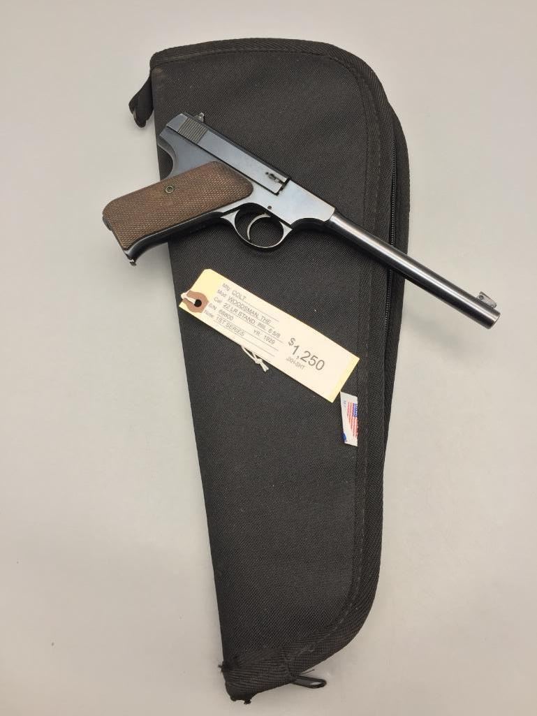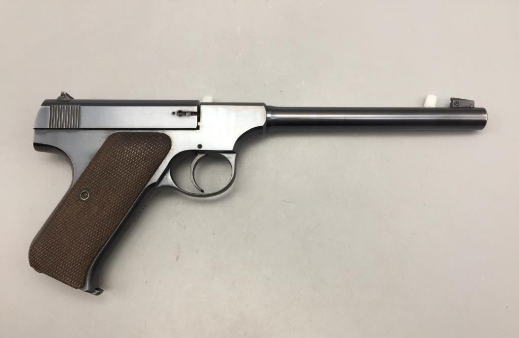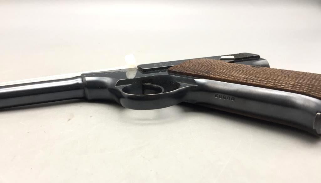 Presented for your consideration is this Colt Woodsman in very good (almost like new) condition for its age. It is .22 long rifle caliber with checkered wood grips and a 6 5/8 inch barrel. It will come with the pistol case pictured. Maker: Colt. Serial No. 68800. Size: Barrel measures 6-5/8 inches. Age: Circa 1929. Please look closely at the pictures - they are an important part of our description. Shipping: There will be a $15 handling / packaging fee for shipping this lot. The actual cost of postage will be added on top of that. *****This firearm requires an FFL Transfer*****