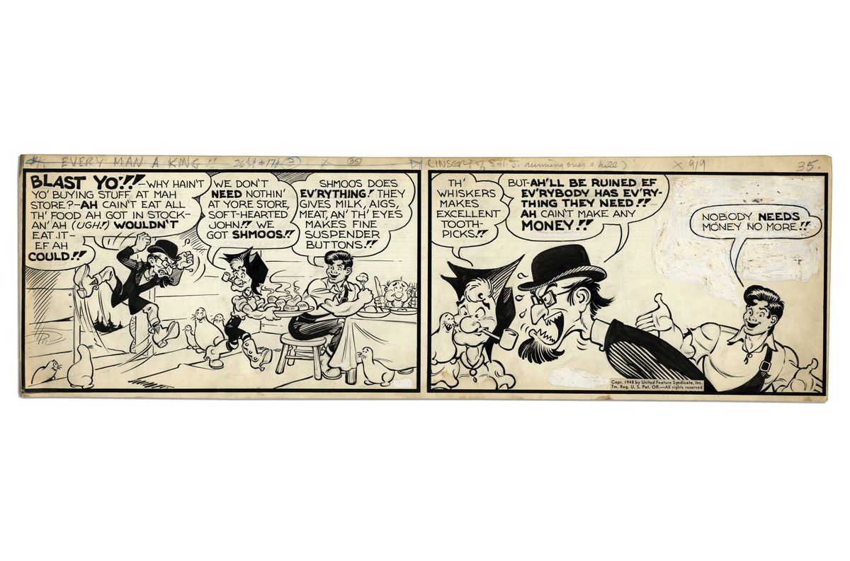 Al Capp hand drawn ''Li'l Abner'' comic strip featuring Shmoos. 2-panel strip from 9 September 1948 depicts Abner dining on a plate of the cooked Shmoo meat Mammy is dishing out in the kitchen, surrounded by living Shmoos, while shopkeeper Soft-Hearted John storms in ranting about his business being down since the townspeople are getting everything they need from Shmoos, as explicated by Abner, ''Shmoos does ev'rything! They gives milk, aigs, meat, an' th' eyes makes fine suspender buttons!...Nobody needs money no more!'' Capp uses his Shmoo creatures as an allegory for animals. Measures 22.5'' x 7''. Toning and white out. Near fine.