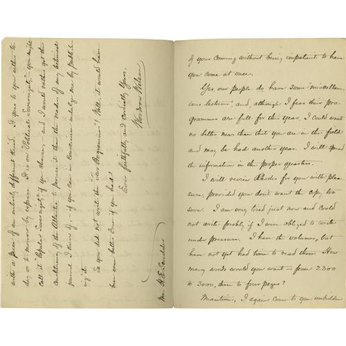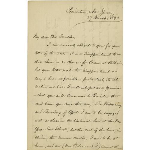 <B>Excellent Content Woodrow Wilson Autograph Letter Signed to the Editor of the</B></I> <B>IAtlantic Monthly</B></I> <B>Discussing His Writings on American History Which Might Be Used in the Magazine.</B></I> Wilson, Woodrow. President. Autograph Letter Signed, 3 full pages large 8vo, Princeton, March 27, 1893 to Horace E. Scudder, editor of the <I>Atlantic Monthly,</B></I> mentioning his teaching and his writings on American history for which he became famous long before he entered politics. Wilson writes: <I>"...It is a disappointment to me that there is no chance for Axson at Williams, but your letter made the disappointment as easy to bear a possible: particularly in its intimation which I will interpret as a promise that you will come over to Princeton the next time you come this way. The Wednesdays and Thursdays of April I am to be engaged with a class in Constitutional Law at the new York Law School; but the rest of the time, including the summer months, I am to be at home, and we (Mrs. Wilson and I) cannot think of your coming without being impatient to have you come at once. Yes, our people do have some 'miscellaneous lectures' and, although I fear their programmes are full for this year, I could want no better news than that you are in the field and may be had another year. I will spread the information in the proper quarters. I will review Rhodes with you with pleasure, provided, you don't want the copy too soon. I am very tired just now, and could not write freshly if I were obliged to write under pressure. I have the volumes, but have not yet had time to read them. How many words would you want - from 2300 to 3000, three to four pages? Meantime, I again come to you unbidden with a piece of an entirely different kind. It goes to you either today or tomorrow by express. It is on 'Political Sovereignty' you might call it 'Popular Sovereignty.' if you choose -- and I would rather get the constituency of the Atlantic to peruse it than the readers of any technical journal I know of, -- if you can in conscience indulge me by publishing it. So you did not write the 'Two Programmes!' Well, it would have been better done if you had..."</B></I> This extremely lengthy letter is in very fine condition, with dark writing. Wilson was currently professor of jurisprudence and political economy at Princeton, and although only 37 had already written a number of books on American history, his biography of Washington being published this same year along with <I>"An Old Maser and Other Essays."</B></I> He was already at work on his monumental <I>"A History of the American People,"</B></I> published in 1902. Scudder himself had written a number of books on American history including a biography of Washington and a set of works on AMerican history for classroom use. He also authored many Children's books, and was a trustee of Williams College where Axson, undoubtedly a younger brother or nephew of Wilson's first wife, Ellen Axson Wilson, wanted to go. Holograph letters of Wilson are very scarce, especially of this length and superlative content.