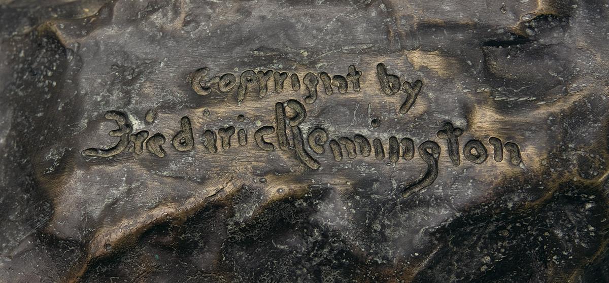 Measuring 28 1/2 inches tall including the marble plinth, this bronze depicts a man on horseback, riding down a steep incline. Bronze construction, with bronze strip details including the horse bridle and whip, and details including a set of three animal traps hanging from the saddle and a flintlock rifle across the horseman's lap. One side of the incline is marked "Copyright by/ Frederic Remington", with no foundry markings visible. Plinth is rounded green marble with a grooved edge.