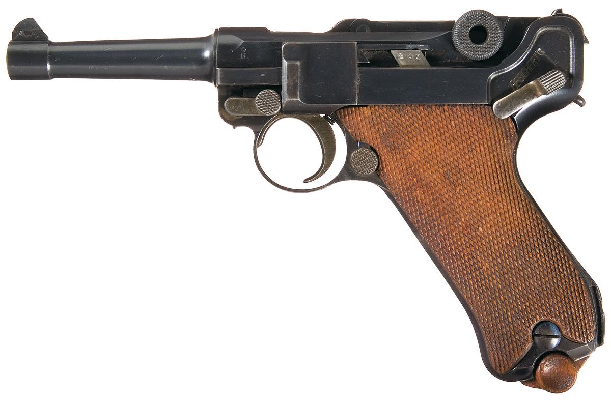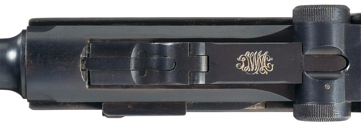Blank chamber and "DWM" monogram on the toggle. "Crown/N" proofs on the left side of the barrel extension, underside of the barrel, and left side of the toggle, and "crown / script letter" proof on the safety bar. Matching numbers on the barrel and frame, with the last two digits on most of the small parts. Marked "GESICHERT" and "GELADEN" on the safety and extractor respectively. Straw colored small parts, unmarked nickel magazine with wooden bottom and fitted with checkered walnut grips.