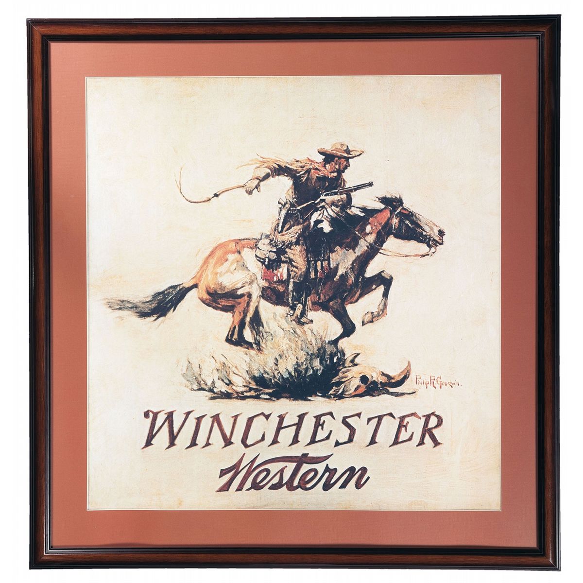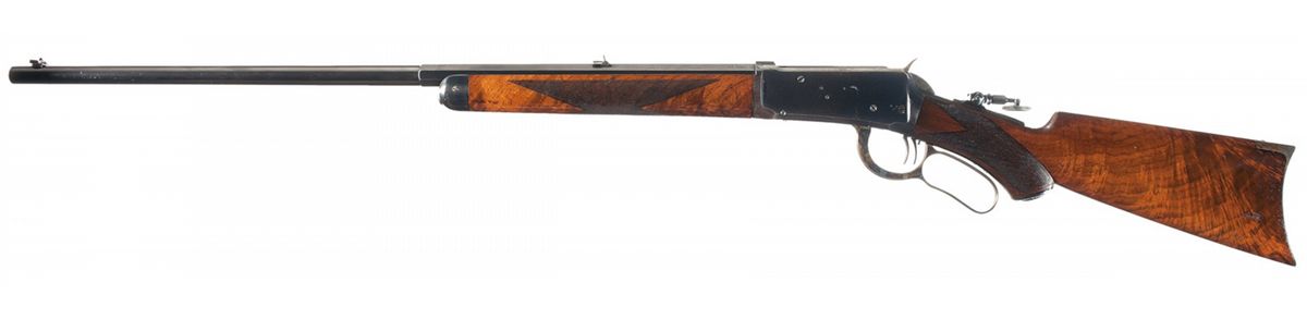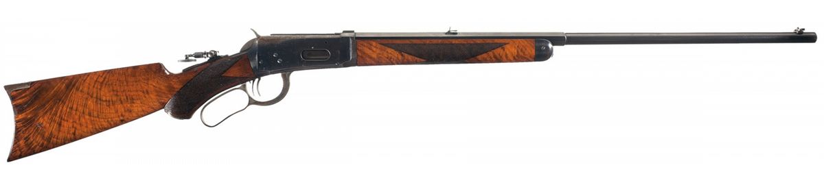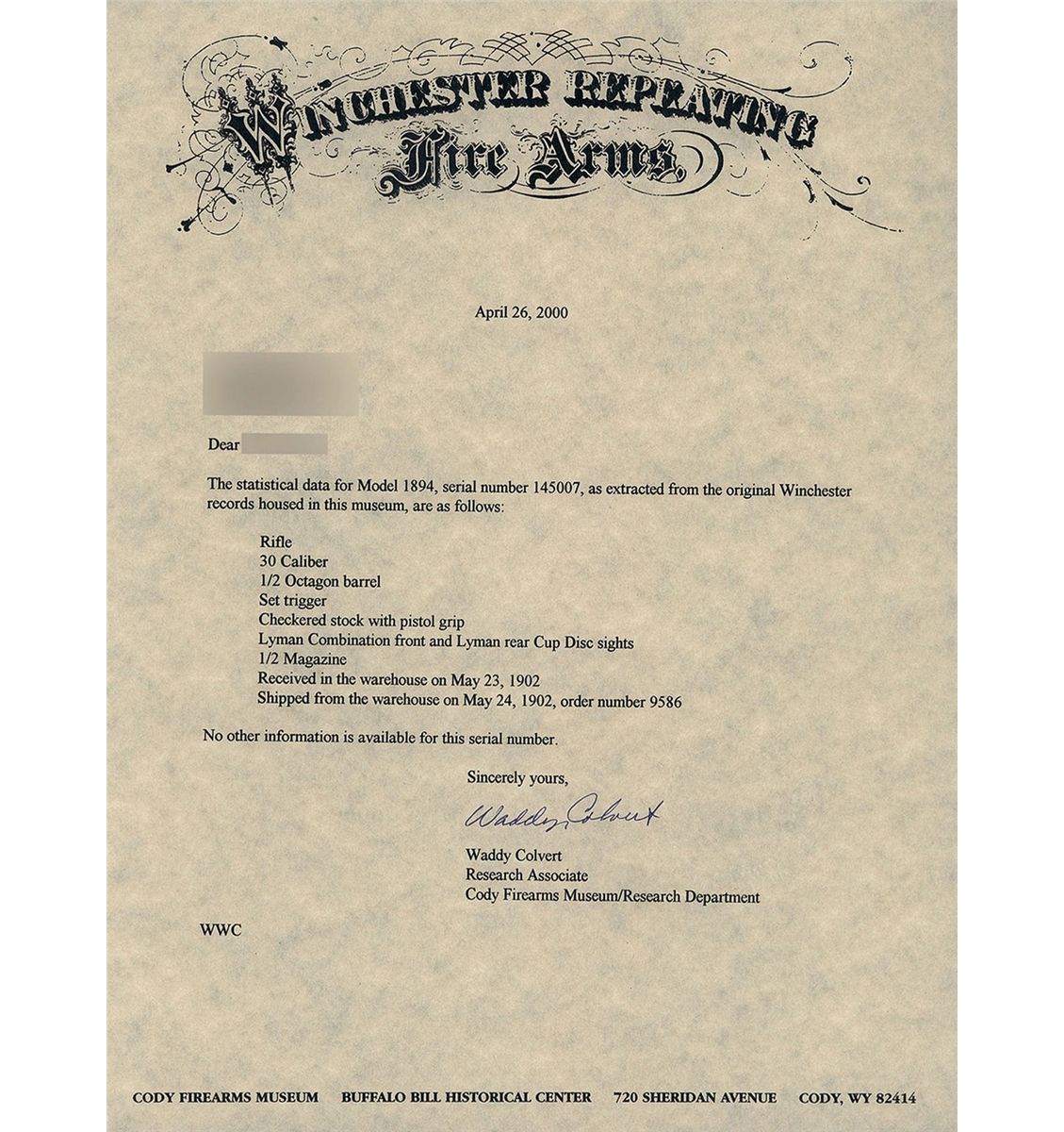 Manufactured on May 6th, 1902 based on research from the Cody Firearms Museum. This excellent Deluxe Winchester Model 1894 Rifle features special order half octagon barrel, close set double set triggers, Lyman sights and deluxe checkered pistol grip stock. The top barrel flat is marked with the two line address ahead of the rear sight, the left rear flat is marked with the two line nickel steel/smokeless powder marking and the top flat at the breech is marked "30 W.C.F.". The left rear upper flat is marked with a London provisional proof followed by ".300" (upside down), and there is a "crown/V" proof on the left side of the receiver ring. The serial number is marked on the bottom front of the receiver. The barrel is fitted with a Lyman combination folding globe sight and a two leaf folding rear sight. There is a tang mounted short range Lyman cup disc peep sight. Blue finish with casehardened hammer, lever and buttplate. There is a hard rubber Winchester grip cap on the stock. The accompanying factory letter verifies the rifle configuration, 30 caliber, 1/2 octagon barrel, set trigger, checkered pistol grip stock, Lyman combination front and rear cup disc sights, 1/2 magazine, that it was received in the warehouse on May 23, 1902 and shipped on order number 9586, May 24, 1902. The rifle comes with a copy of the book "Winchester An American Legend" by R.L. Wilson and a 33 inch by 34 inch nicely framed and matted print of the Winchester cowboy done by Phillip Goodwin (see image).