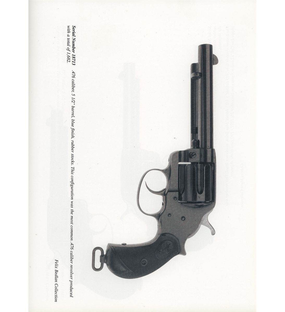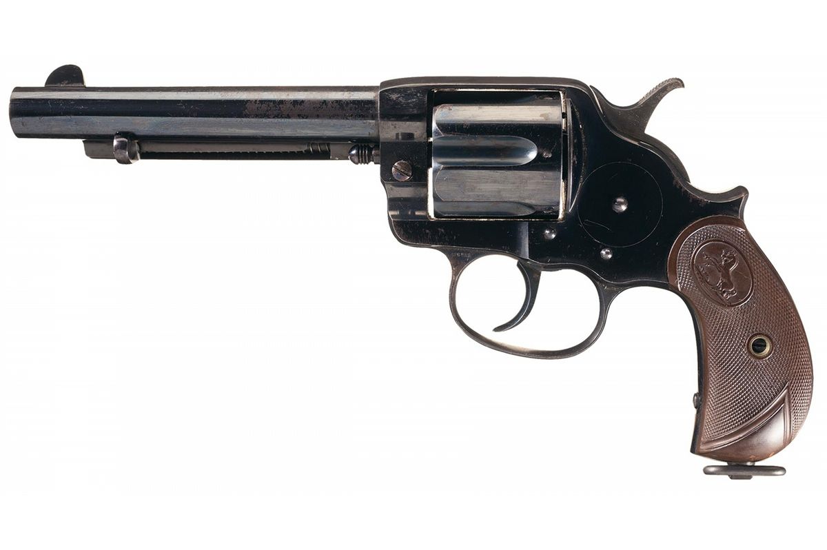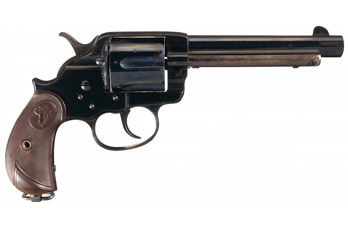Also known as the Enfield Mark III Ball cartridge, the 476 was introduced in 1881 due to concerns regarding the Mark II .455 caliber round properly engaging the rifling of the Enfield revolver. Though phased out of British service in 1887, the Woolwich Arsenal continued Mark III cartridge production into the 1890s, and Dum in India produced the cartridge clear into World War One. This particular revolver was manufactured in 1887. The top of the barrel is marked with the one Hartford/Pall Mall address "476 CAL" on the upper left front of the trigger guard. London Proofhouse "Crown/V" and "Crown/GP" markings are present on the underside of the barrel and alternating on the cylinder behind each flute. The partial matching serial number "713" is marked on the rear face of the cylinder and the loading gate is marked with the assembly number "446". All blue finish with niter blue hammer and trigger, and fitted with checkered hard rubber grips with the Rampant Colt in an oval at the top and a lanyard ring on the butt. This revolver can be seen in a full page spread on page 362 of Don Wilkerson's "Colt's Double Action Revolver Model of 1878", which gives a production number of only 1,682 for this configuration.