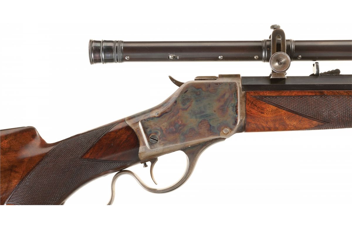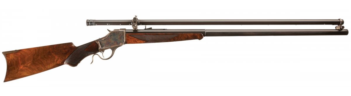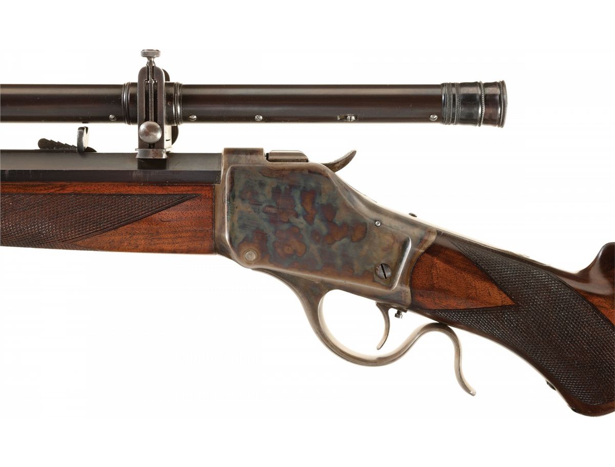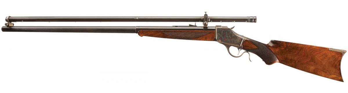 Winchester Model 1885 "High Wall" single shot target rifle manufactured in 1887. The rifle is accompanied by a Cody Firearms Museum letter that lists the rifle features as: "32/40. #3, 30-inch, 1/2 octagon barrel, Set trigger. Checkered stock, Pistol grip, Lyman and Beach sight" and Rod in butt". The letter states that the rifle was shipped from the Winchester warehouse on April 11, 1887. The rifle has a blued barrel and color casehardened receiver, breechblock, hammer, lever and crescent buttplate. The forearm and pistol grip stock are fancy grain highly figured walnut with "Style H" checkering and high polish "piano" finish. The pistol grip and forearm tip have ebony inlays. The rifle has a thinside receiver and hammer with the early style milled knurling. A Malcolm telescopic sight is mounted on the barrel using the front sight dovetail and a second dovetail behind the rear sight. The telescopic sight has a 33 1/4-inch blue tube marked: "WM MALCOLM/SYRACUSE/NY". The 30 inch 1/2-round/1/2-octagon No. 3 barrel has the original Beach front sight replaced with the Malcolm front sight base and has a dovetail mounted sporting style rear sight. The upper receiver tang is factory drilled and tapped for a rear sight and appears to have originally been fitted with a Lyman folding combination rear sight referenced in the factory letter. The buttplate has a sliding brass trap door and the trap contains a five-piece jointed steel cleaning rod with brass tip. The top barrel flat is roll-stamped with the two-line legend "-MANUFACTURED BY THE-/-WINCHESTER REPEATING ARMS CO. NEW HAVEN. CONN. U.S.A.-" ahead of the rear sight. The caliber designation "32-40" is stamped on the top barrel flat between the telescopic sight mount dovetail and the receiver. The lower receiver tang is stamped with the serial number "9183" in script numerals. The Model 1885 Rifle was the first John M. Browning designed firearm manufactured by Winchester and launched the long and historical association between Winchester and firearms genius John Browning.