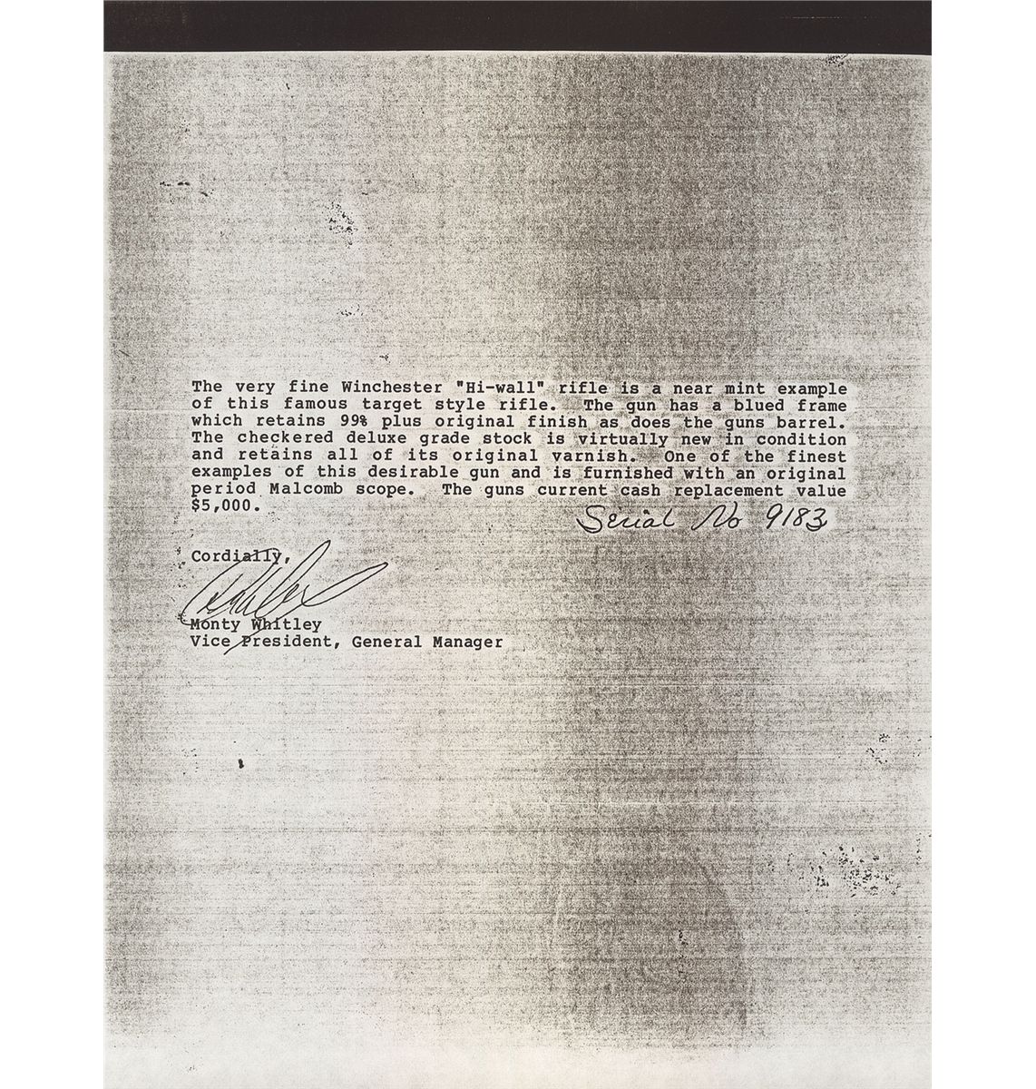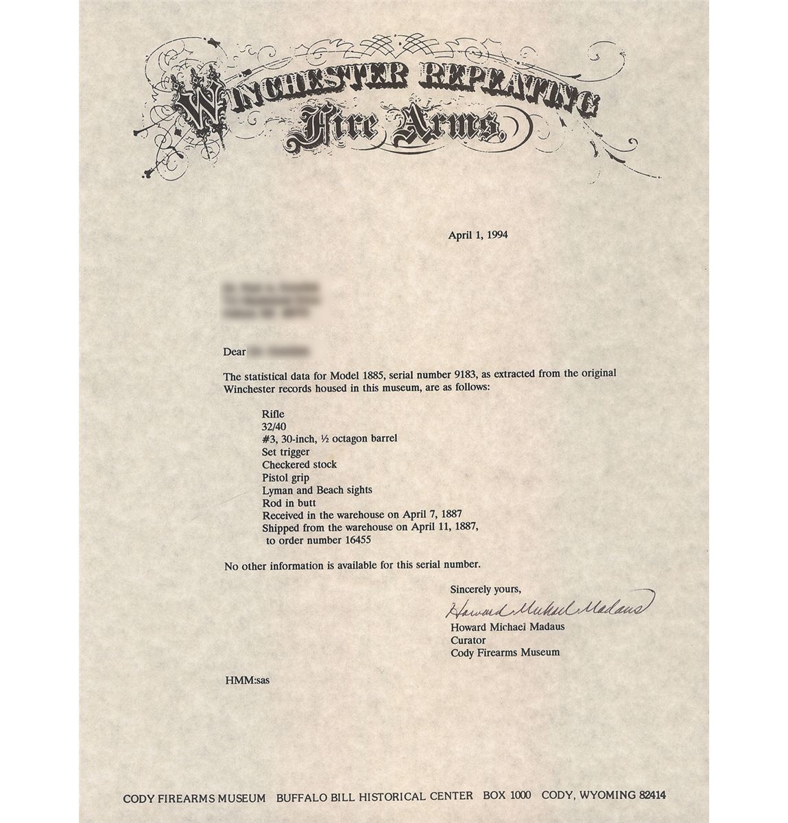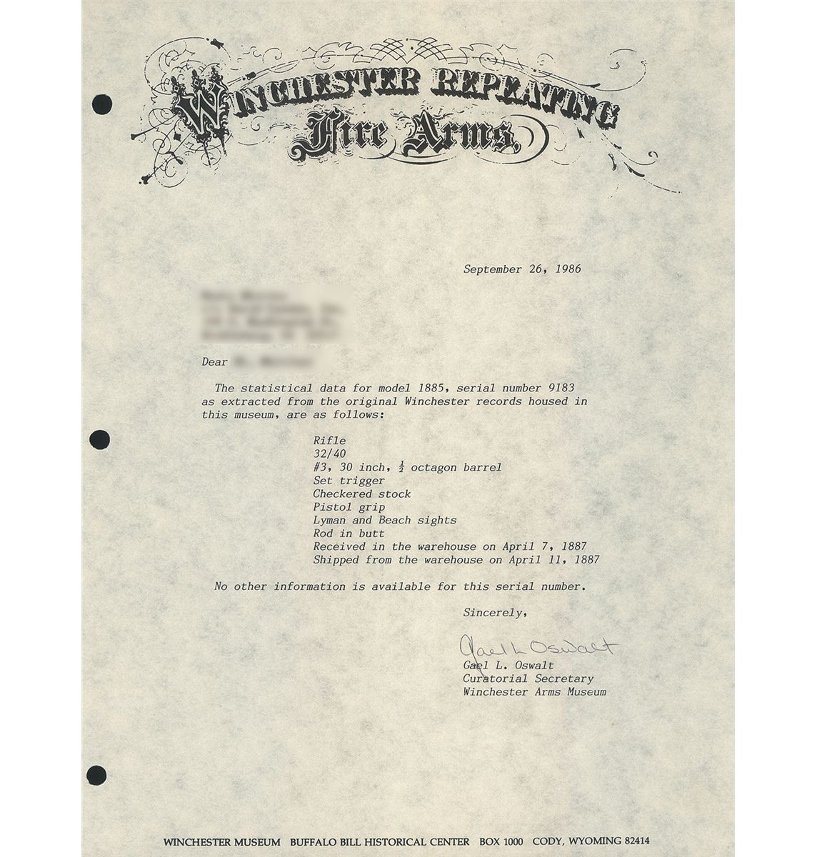Winchester Model 1885 "High Wall" single shot target rifle manufactured in 1887. The rifle is accompanied by a Cody Firearms Museum letter that lists the rifle features as: "32/40. #3, 30-inch, 1/2 octagon barrel, Set trigger. Checkered stock, Pistol grip, Lyman and Beach sight" and Rod in butt". The letter states that the rifle was shipped from the Winchester warehouse on April 11, 1887. The rifle has a blued barrel and color casehardened receiver, breechblock, hammer, lever and crescent buttplate. The forearm and pistol grip stock are fancy grain highly figured walnut with "Style H" checkering and high polish "piano" finish. The pistol grip and forearm tip have ebony inlays. The rifle has a thinside receiver and hammer with the early style milled knurling. A Malcolm telescopic sight is mounted on the barrel using the front sight dovetail and a second dovetail behind the rear sight. The telescopic sight has a 33 1/4-inch blue tube marked: "WM MALCOLM/SYRACUSE/NY". The 30 inch 1/2-round/1/2-octagon No. 3 barrel has the original Beach front sight replaced with the Malcolm front sight base and has a dovetail mounted sporting style rear sight. The upper receiver tang is factory drilled and tapped for a rear sight and appears to have originally been fitted with a Lyman folding combination rear sight referenced in the factory letter. The buttplate has a sliding brass trap door and the trap contains a five-piece jointed steel cleaning rod with brass tip. The top barrel flat is roll-stamped with the two-line legend "-MANUFACTURED BY THE-/-WINCHESTER REPEATING ARMS CO. NEW HAVEN. CONN. U.S.A.-" ahead of the rear sight. The caliber designation "32-40" is stamped on the top barrel flat between the telescopic sight mount dovetail and the receiver. The lower receiver tang is stamped with the serial number "9183" in script numerals. The Model 1885 Rifle was the first John M. Browning designed firearm manufactured by Winchester and launched the long and historical association between Winchester and firearms genius John Browning.
