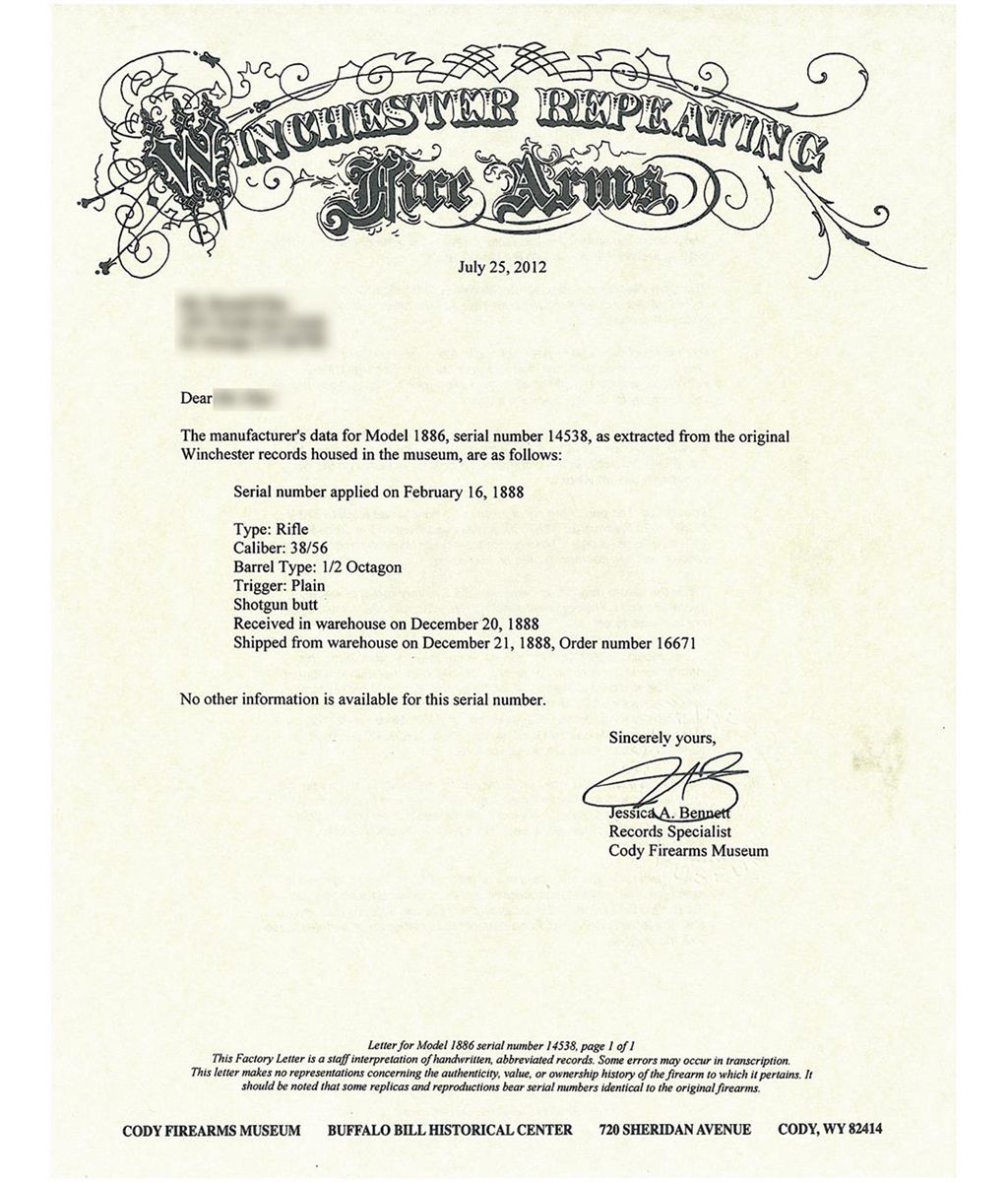 Winchester Model 1886 rifle with Cody Firearms Museum letter. The letter lists the rifle features as "Caliber:38/56", "Barrel Type: 1/2 Octagon", "Trigger: Plain", and "Shotgun butt". It states that this rifle was shipped from the Winchester warehouse on December 21, 1888. The rifle has a blue barrel, full length magazine and steel shotgun buttplate. The forearm cap, receiver, hammer and lever are casehardened. The stock and forearm are straight grain American walnut. The barrel has a sporting style front sight with nickel silver blade and sporting style buckhorn rear sight. The upper tang is factory drilled and tapped for a rear sight. The top barrel flat is roll-stamped with the two-line Winchester legend "-MANUFACTURED BY THE-/-WINCHESTER REPEATING ARMS CO. NEW HAVEN. CONN. U.S.A.-" ahead of the rear sight. "38-56 W.C.F." is stamped on the top barrel flat at the breech. "-MODEL 1886-" is roll-stamped on the upper receiver tang. The lower receiver tang is marked with the 1884 and 1885 patent dates behind the trigger and has the serial number, "14538" roll-stamped in script numerals ahead of the tang screw.