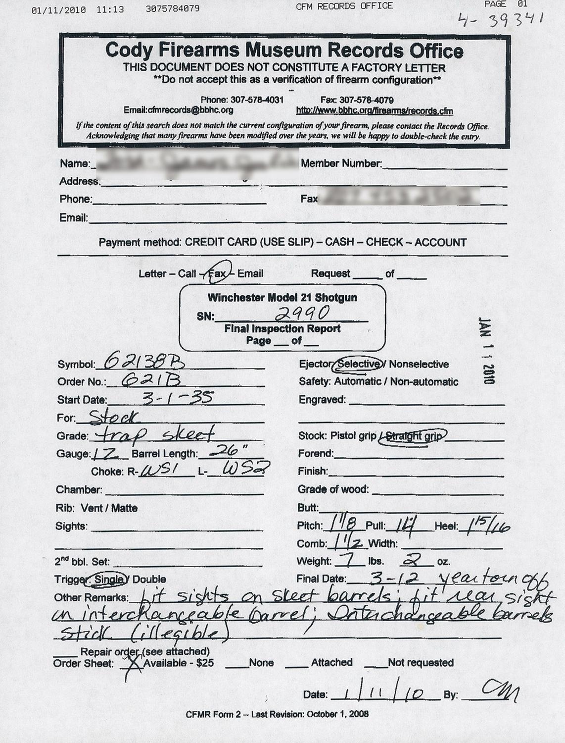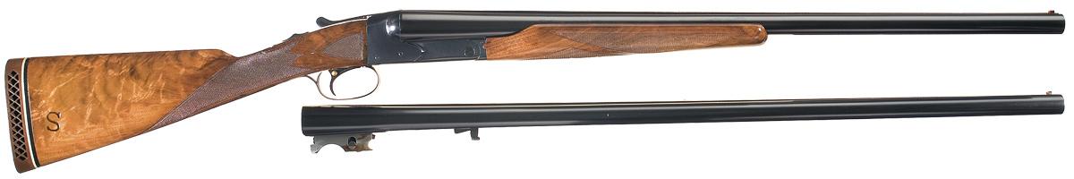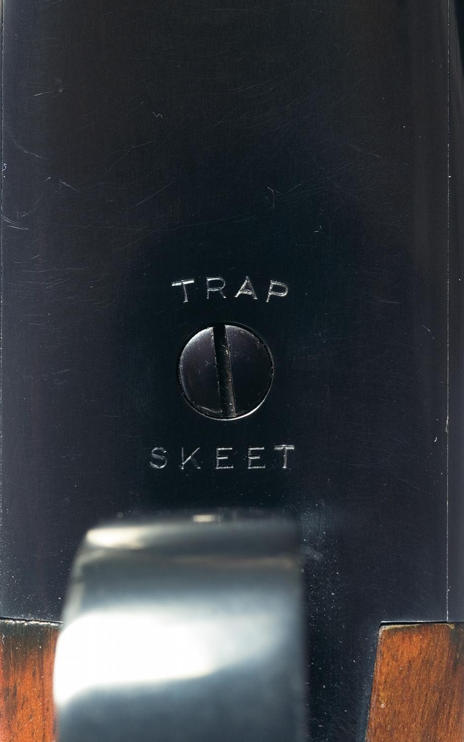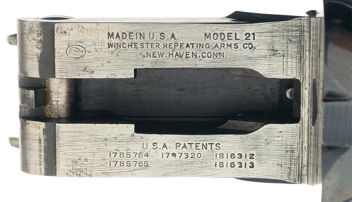 Introduced by Winchester in 1931 the Model 21 was one of the companies finest efforts with regard to quality, reliability and strength. This Trap Skeet Grade shotgun features two sets of barrels. The 26" skeet barrels have a single red bead sight on the concave solid matte rib, 2 3/4" chambers, choked "WS2" and "WS1" with ejectors. The second set of barrels is 30" in length, 2 3/4" chambers and choke marked full/modified with ejectors. The 30" barrels are marked with the model, trade mark, gauge and chamber on top of the right breech end and the two line address on the left. The 26" set is marked "WINCHESTER-12 GAUGE / 2 3/4 CHAM" on the left rear. The water table is marked with the model and address on the right side and the patent numbers on the left. The bottom of the receiver is marked "TRAP / SKEET" directly ahead of the trigger guard. Tang mounted safety, single trigger with selector and mounted with a checkered beaver tail forearm and straight grip stock with an "S" branded on the right rear of the stock and a red vented recoil pad. Length of pull is 13". The accompanying Cody verification letter verifies the serial number, start date of 3-1-35, for stock trap skeet grade, 12 gauge, 26" barrel, chokes, selective ejector, straight grip stock, single trigger and final date as 3-12 "year torn off" (more than likely 1935). Other remarks reads "Lit sights on skeet barrels; fit rear sight on interchangeable barrel, Interchangeable barrels stick (illegible). Length of pull is 12 7/8".