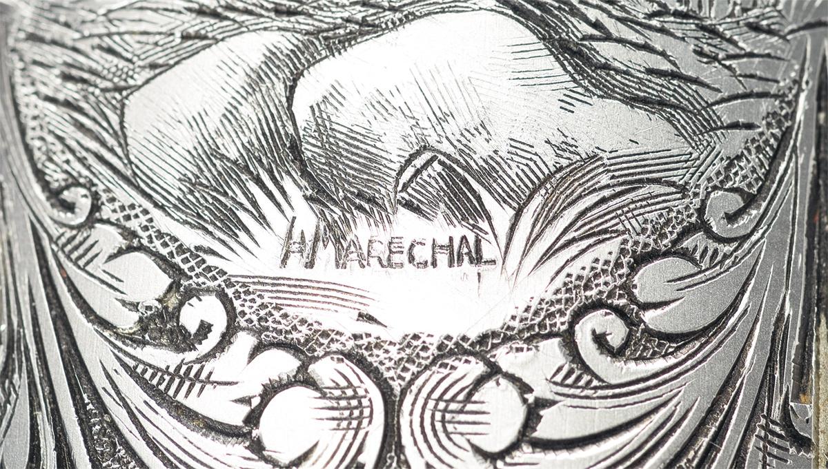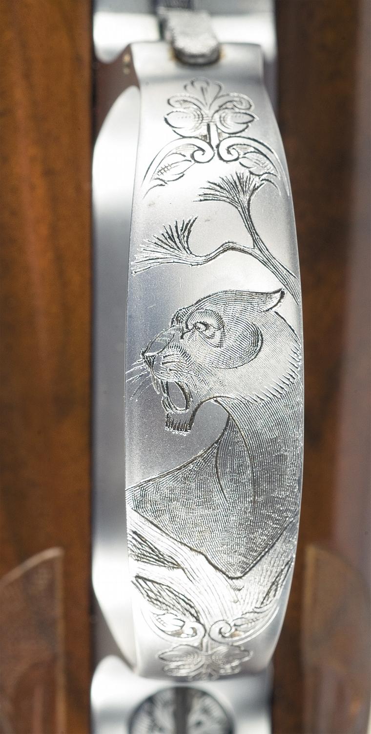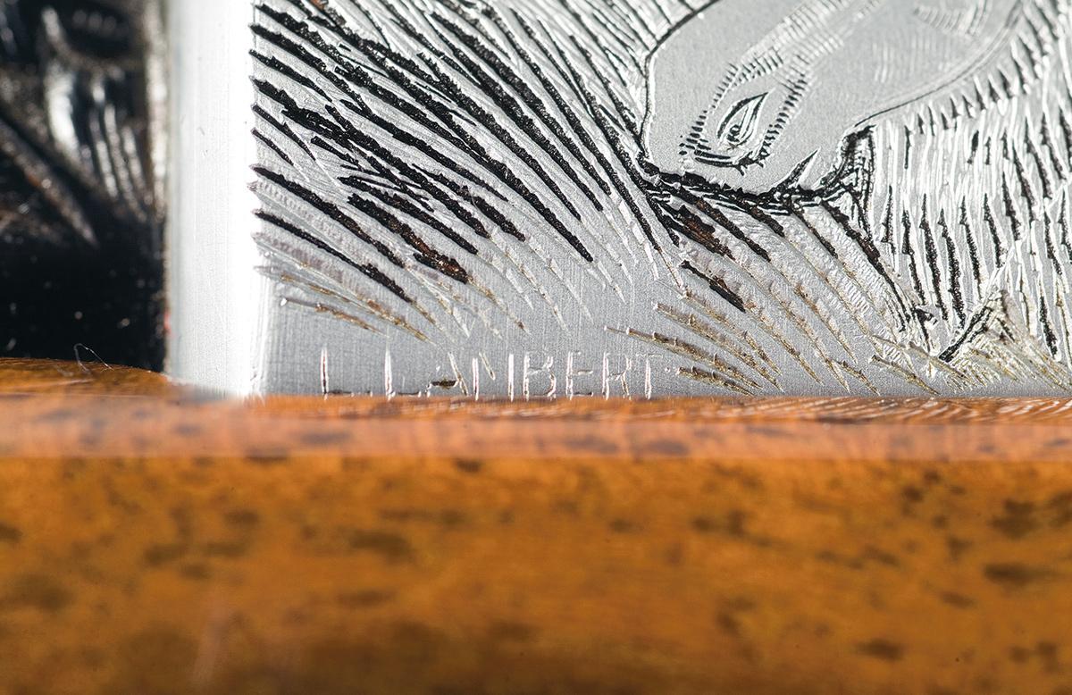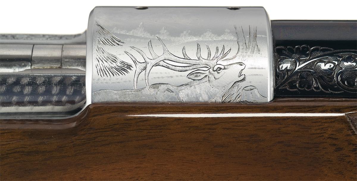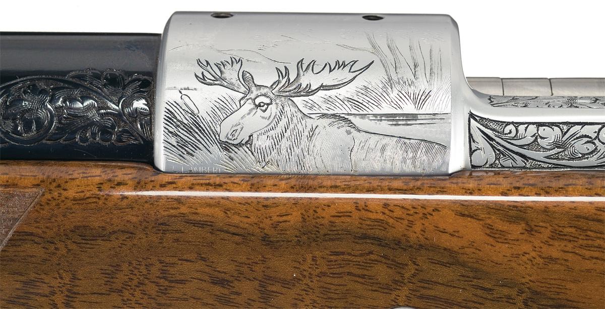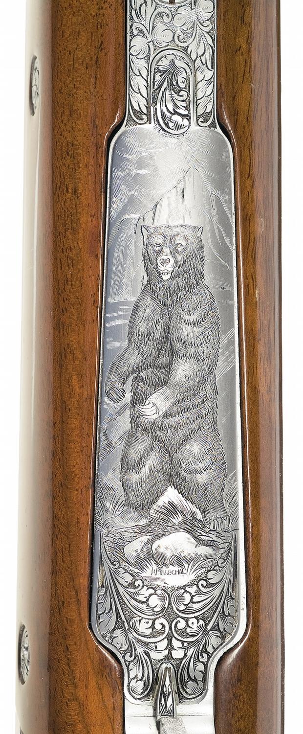 Manufactured in Belgium, this rifle features a blue barrel manufactured without sights and French grey finish on the remaining parts. The top of the receiver has been factory drilled and tapped for scope mounting. The follower and bolt are polished with a desirable long jeweled extractor, and the trigger is gold washed. The front receiver ring is engraved with a bugling elk on the right side, a moose in a field scene on the right side and the remainder of the action is scroll leaf and punch dot engraved. The hinged floor plate engraved with a standing bear in a mountain scene with floral scroll engraving below and on the attaching metal. The trigger guard is engraved with a mountain lion. The left side of the front receiver ring is signed "L. LAMBERT" and the floor plate is signed "A MARECHAL". There is a two inch wedge of floral scroll engraving on each side of the breech end of the barrel. The screw heads and stock bolts are also engraved. The stock is extra fancy select walnut with a high gloss finish, fine line checkering and floral and punch dot hand carving on the forearm and grip area, contrasting forend and grip cap with a diamond shaped brass inset on the grip cap, raised comb, cheekpiece, vented Browning rubber recoil pad and sling swivel studs.