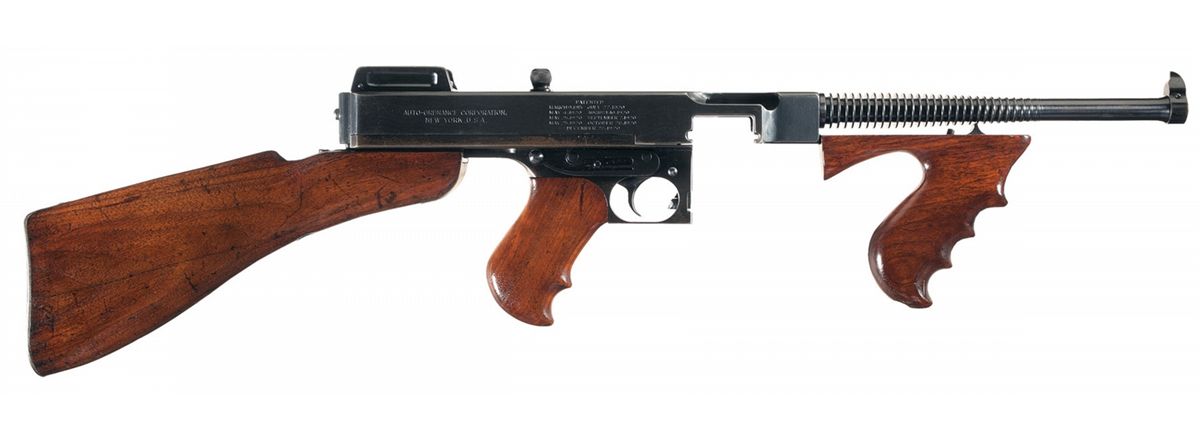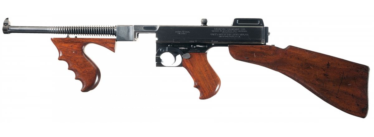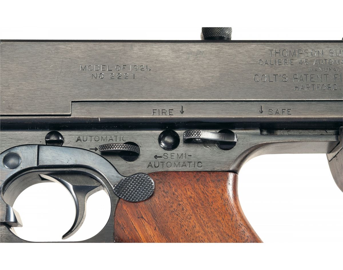 This is a beautiful example of an original, early production Thompson submachine gun as produced by the Colt Firearms Company circa 1921/22. This specific submachine gun remaining in it's early original 1921 configuration. These early 1921 SMG set the standard for all future SMGs produced by all countries. The Thompson SMG is probably one of the most famous and easily recognized SMGs ever produced and made infamous during the 1920s and 1930s by the various U.S. law enforcement agencies during the prohibition and gangland warfare era and again in 1928 by the USMC for use in Nicaragua. These 1921 models had somewhat mediocre sales during this time and most of them were upgraded to the 1928 model and were then stamped 1921/28. This early production model remains in it's original configuration with the original unaltered receiver markings, high polish blue finish, vertical fore-grip and short barrel as produced without the "Cutts" compensator. This is based on their superior manufacturing, using solid steel, fully machined parts which exhibit excellent fit and finish, that were highly reliable. If you ever have a chance to disassemble one of these weapons you will be amazed at how well they were manufactured, the parts just slide together like glass. This specific weapon still has the early distinctive Thompson features such as; the original short 10 1/2 inch barrel with cooling fins without the "Cutts" compensator, early "AUTOMATIC and SEMI-AUTOMATIC" receiver markings, vertical front pistol grip, detachable buttstock and the fully adjustable Thompson ladder rear sight that is graduated from 100-600 yards, and the original early style, large headed, recoil spring guide. The left side of the receiver is now marked "MODEL OF 1921/NO 2221" with the original factory markings block towards the rear of the receiver marked "THOMPSON SUBMACHINE GUN/CALIBER .45 AUTOMATIC COLT CARTRIDGE/MANUFACTURED BY/COLT'S PATENT FIRE ARMS MFG. CO./HARTFORD, CONN. U.S.A.". The right side is marked with the five lines of patent dates along with the two line "AUTO-ORDNANCE CORPORATION, NEW YORK U.S.A". The top of the receiver is marked with the original Auto-Ordnance "Bullet" logo with the early markings of "AUT-ORD-CO." inside the bullet logo. The serial numbers on the receiver and lower receiver/trigger housing group have matching numbers (2221) and this early example does not carry any additional visible Police markings. This excellent early SMG, does not have any magazines or accessories, however they are very easily acquired on the secondary market. Additional information: this specific SMG was produced in the June-July 1921 time frame and was issued to the West Virginia, State police, as noted in the excellent reference book: "The Ultimate Thompson Book" by Tracie Hill.