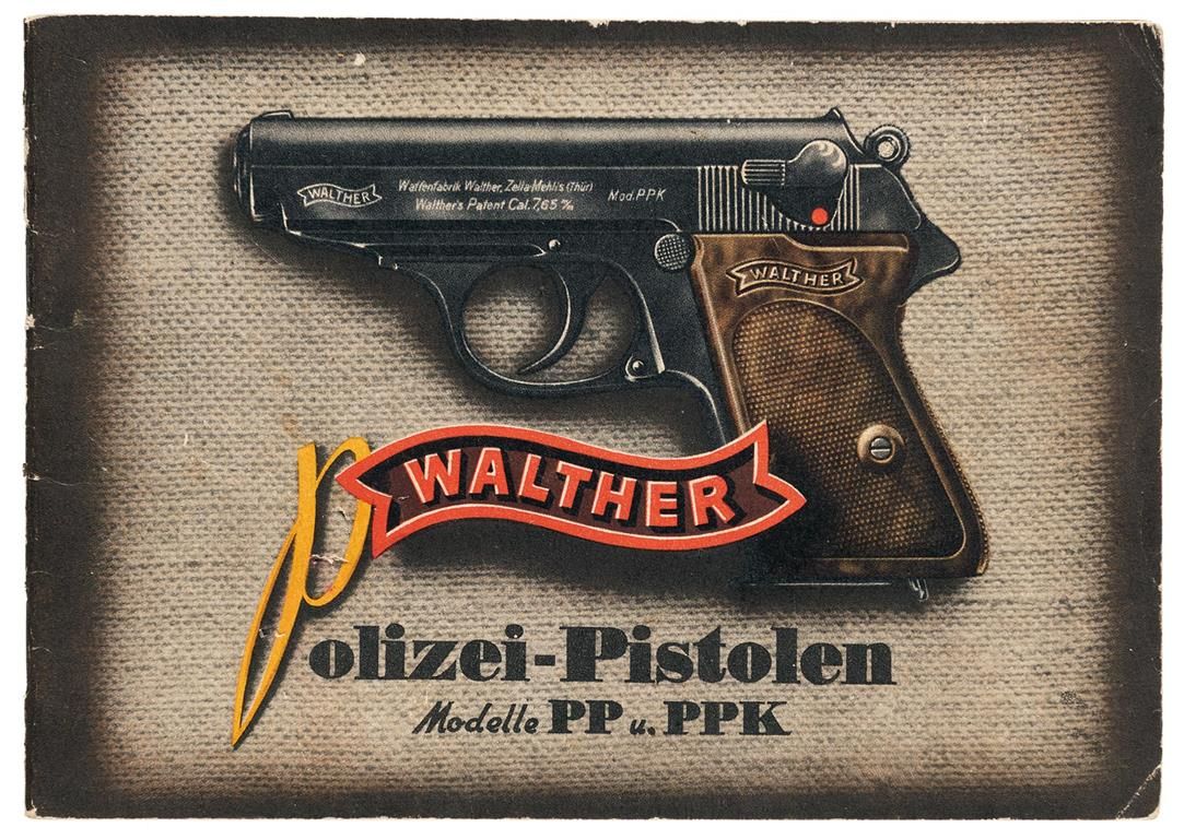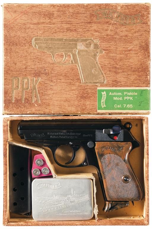 This is an outstanding example of a near new, pre-war commercial Walther pistol that is complete with its original and matching brown Walther PPK storage/shipping box, with Walther tin, spare magazine, cleaning rod and original manual. The slide has the standard Walther banner followed by the two line address and caliber designation followed by "Mod PPK". The right side of the chamber area of the barrel, and the slide are marked with the "Crown/N" commercial proof with the serial number 223664k) marked vertically on the right side of the frame. It is fitted with the standard fixed sights and has the one-piece brown checkered plastic grips with the Walther banner at the top on each side. It is complete with the original magazine that is marked "WALTHER/PPK/7.65 m/m", with matching mottled brown finger extension base. The box is an original brown cardboard Walther PPK shipping box marked on the lower right corner with a green Walther factory label that is marked the Walther Banner next to "Autom. Pistole/MOD. PPK/Cal. 7.65" and the end label is stamped "223664K". As noted this excellent pistol is complete with the 1937 dated manual, spare magazine, 3 test rounds, cleaning rod, Walther factory tin, oil bottle and horse hair brush.