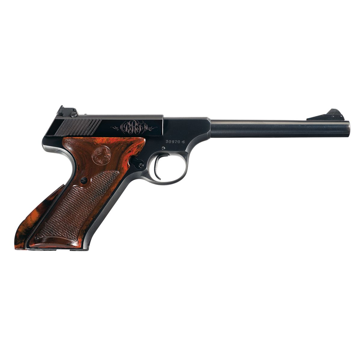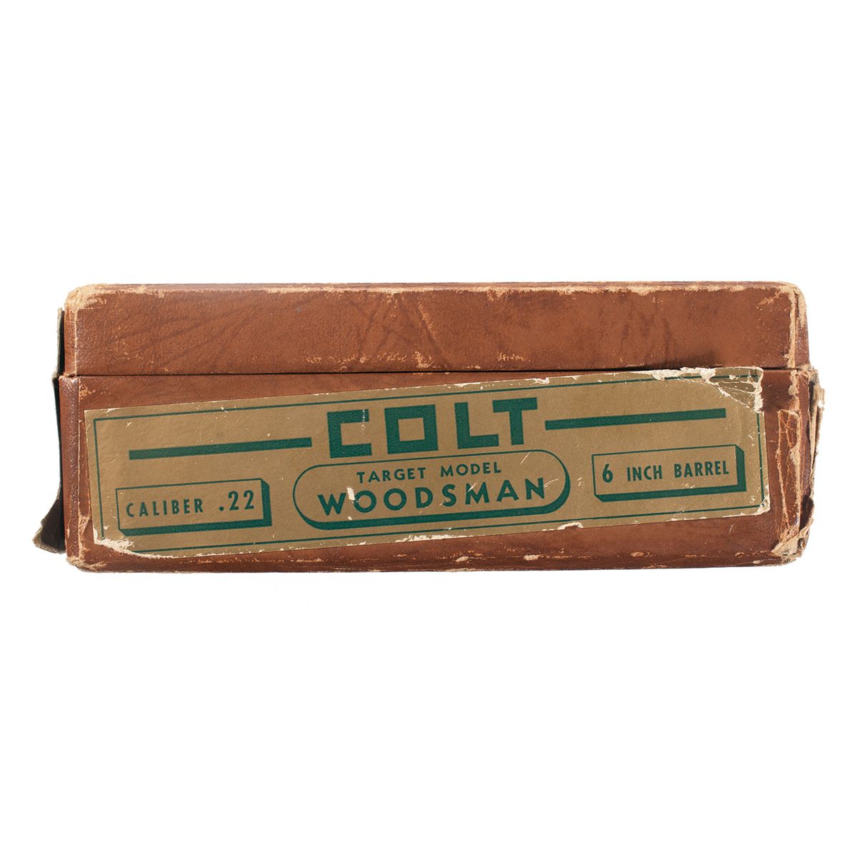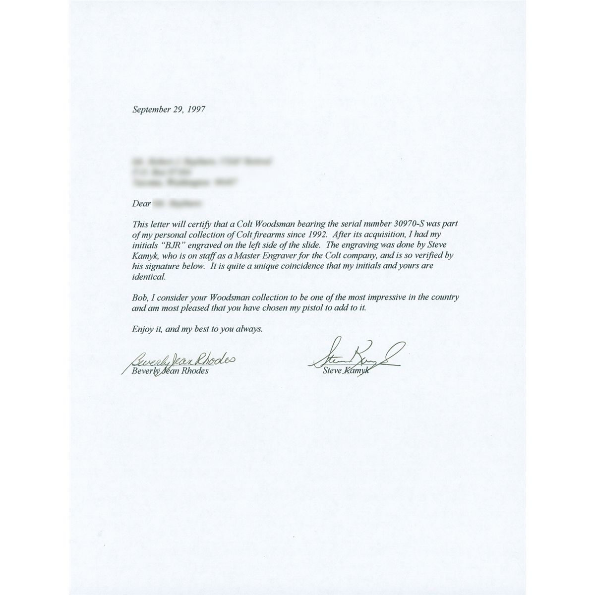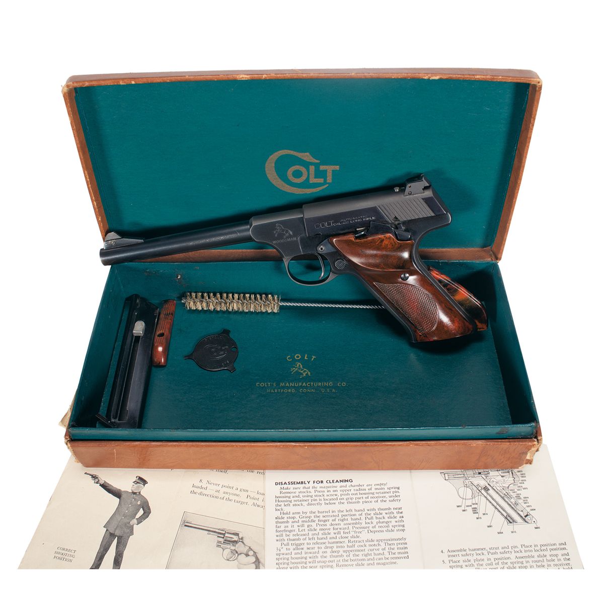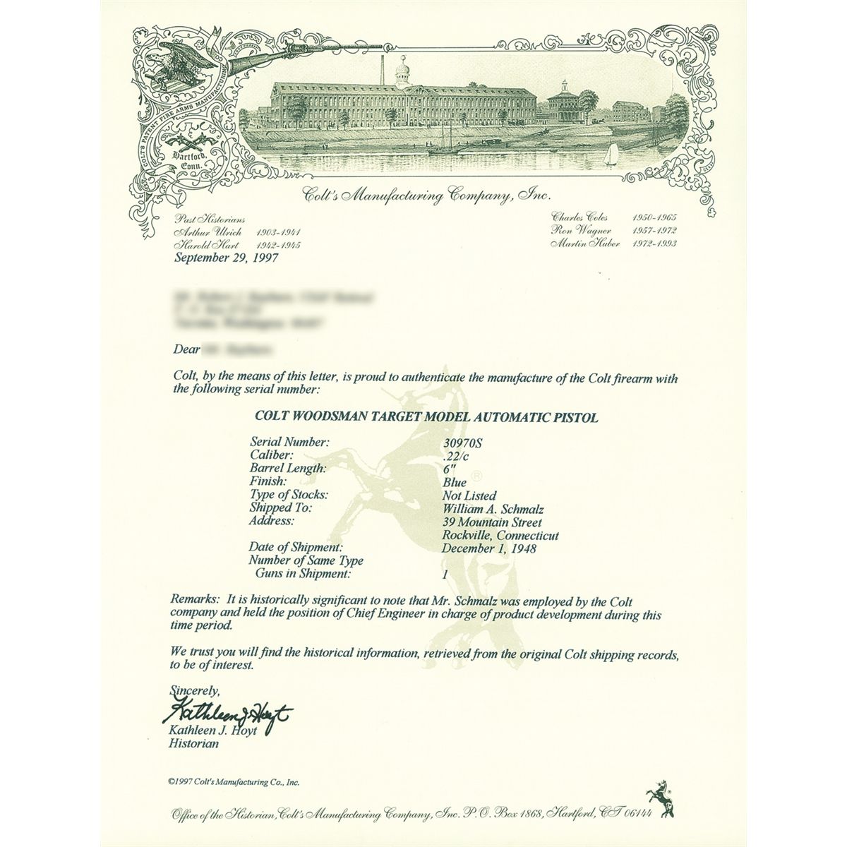 Manufactured in 1949, the second year of production for the Second Series Target Model. The left side of the barrel is marked with the one line address, the left side of the frame is marked with the Rampant Colt over "WOODSMAN" and the slide is marked "COLT" followed by the two line caliber designation, with the serial number on the right side of the frame. The right side of the frame has been factory inscribed "BJR". The initials stand for Beverly Jean Rhodes who was an Archivist at the Colt Historical department. The pistol is accompanied by a typed letter certifying that the pistol was part of her personal collection since 1992 and after acquiring the pistol had her initials "BJR" engraved on the left side of the slide, (an apparent error on her part), and that the engraving was done by Steve Kamyk, who was on staff as a Master Engraver at the time. The letter is signed by Rhodes and Steve Kamyk's signature is on the letter for verification. The pistol has the standard ramped blade front and adjustable target rear sights, serrated trigger, push button magazine release, blue Colt marked magazine and fitted with checkered "Coltwood" target grips with right hand thumb rest and back strap adaptor. The accompanying factory letter verifies the serial number, caliber, 6 inch barrel, blue finish, grips as "Not Listed" and that it was shipped as 1 to William A. Schmalz in Rockville, Connecticut on December 1, 1948. In remarks the letter states "It is historically significant to note that Mr. Schmalz was employed by the Colt company and held the position of Chief engineer in charge of product development during this time period." Complete with an original brown hinged lid box with gold embossed Rampant Colt on the lid and gold "COLT" on the inside of the lid, manual, "Shooting Suggestion" pamphlet, brush and a second grip adaptor.