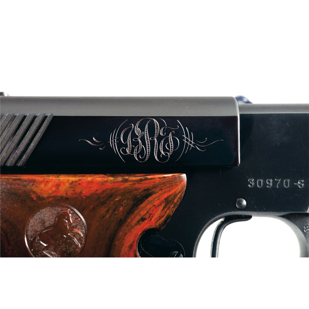 Condition: Partially refinished, the slide at the time of engraving, with all of the blue finish on the slide and 98% original finish on the remaining parts, with some minor muzzle and high edge wear, and overall a few minor scratches and handling marks. The grips are excellent with a few very slight handling marks and sharp checkering. The markings remain clear and crisp. Mechanically excellent. The box is good with some heavy corner and edge wear.