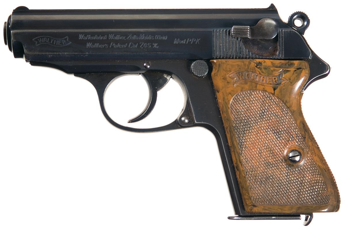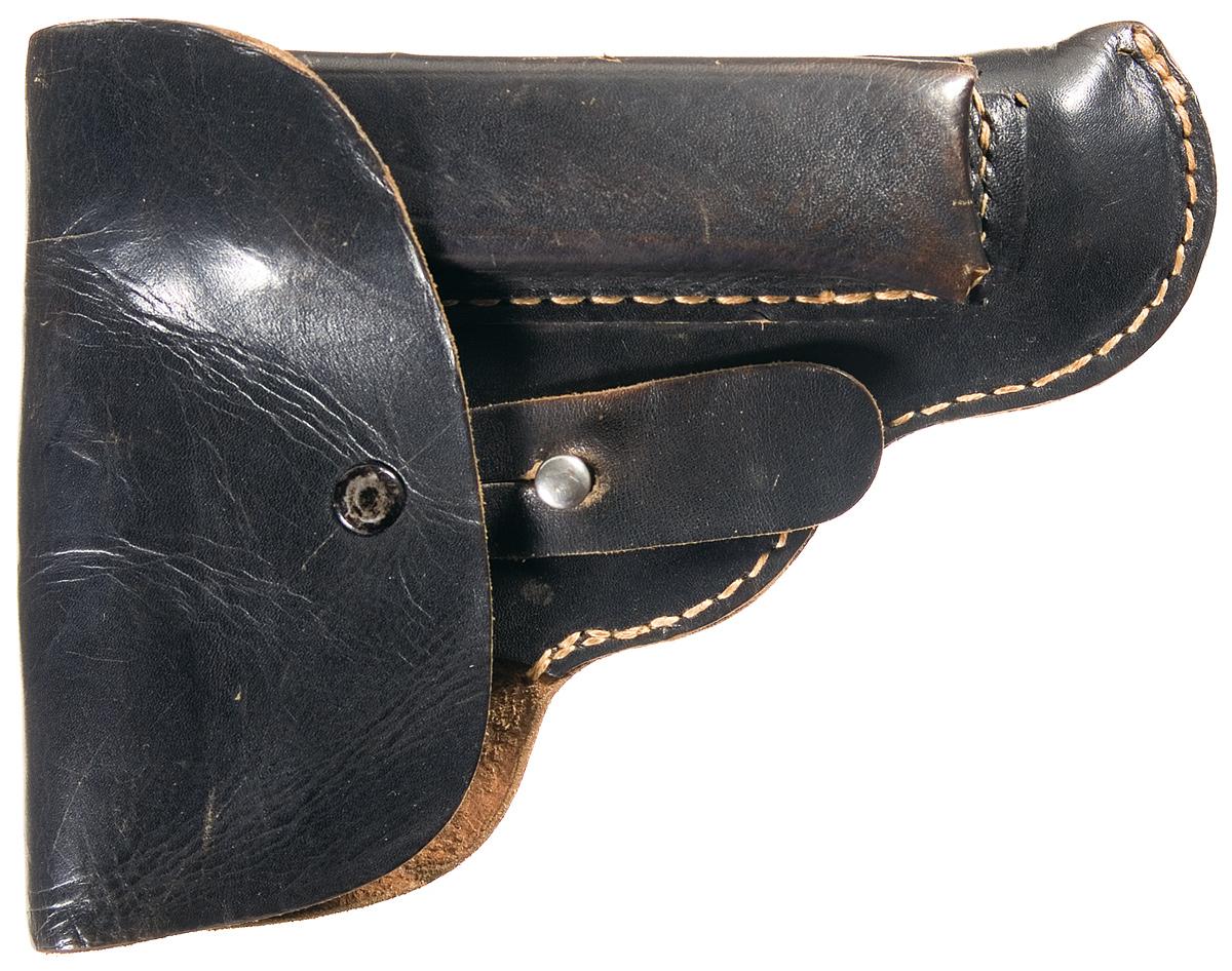 Fixed sights and standard address and model markings, with "crown/ N" commercial proofmarks, 90 degree safety switch, ring hammer and checkered Walther banner grips. Matching number inside the slide. With an unmarked brown leather flap holster.