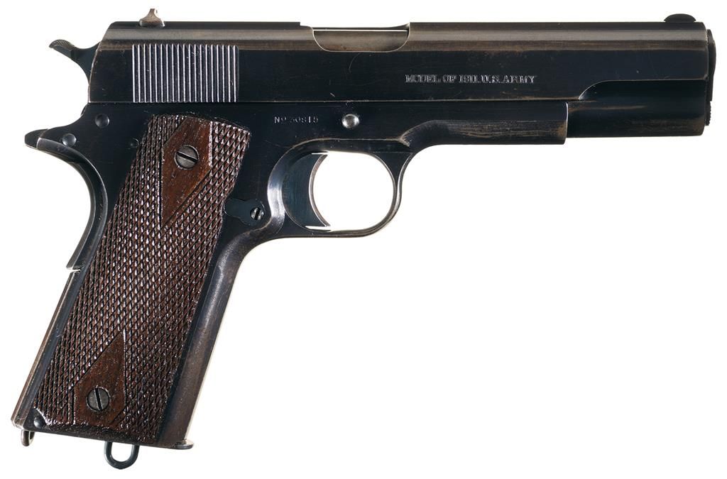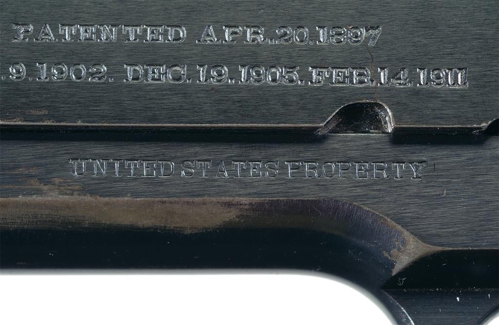 This is an excellent example of a early WWI Colt Model 1911 pistol manufactured in 1913 and it is one of the 1,000 pistols shipped to the Commander of Rock Island Arsenal in May 1913. The left side of the frame has the circled "WGP" proof of the U.S. Ordnance inspector Major Walter G. Penfield with "UNITED STATES PROPERTY" stamped on the front edge of the frame extension. The left side has the two line, two block markings of "PATENTED APR.20,1897/SEPT.9, 1902. DEC.19,1905.FEB.14, 1911" followed by "COLT'S PT. F.A.MFG.CO/HARTFORD CT./U.S.A.". It still retains the early narrow front sight with the round top rear sight. It has the early thumb safety with the cuts on the underside and rear sight of the thin lever. It still retains the other early Colt parts such as the smooth trigger, checkered slide stop, checkered thumb safety and magazine release with the flat main spring housing, wide spur hammer and later production replacement Colt barrel with the separated "H" and "P" proofmarks. The rear of the slide has the provision "H" proof and there is an "H 4" proof on top of the frame by the disconnector hole. It has the standard checkered walnut grips with large diamond patterns around the screws. It is complete with one early blue magazine with the lanyard loop on the bottom.