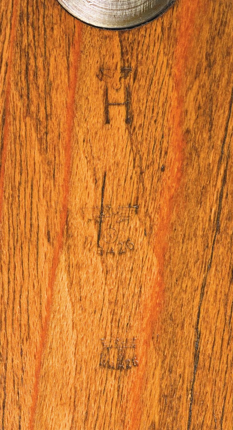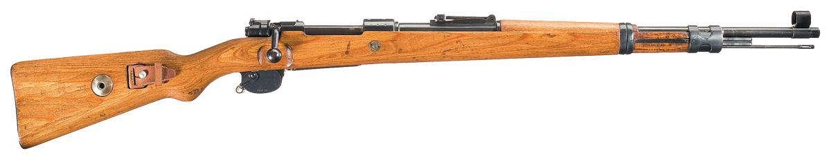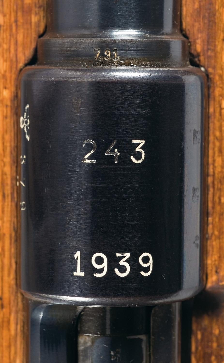 Hooded blade and tangent sights, with "eagle/ 26" proofs on the barrel and receiver ring, "36" partially covered by the stock, and "243/ 1939" on top of the ring. Matching numbers and milled components. Smooth stock, with "eagle/ H" Heer stamp and flat buttplate. With a brown leather sling and a winter trigger, stamped "S/ Mod.98" on the right side.