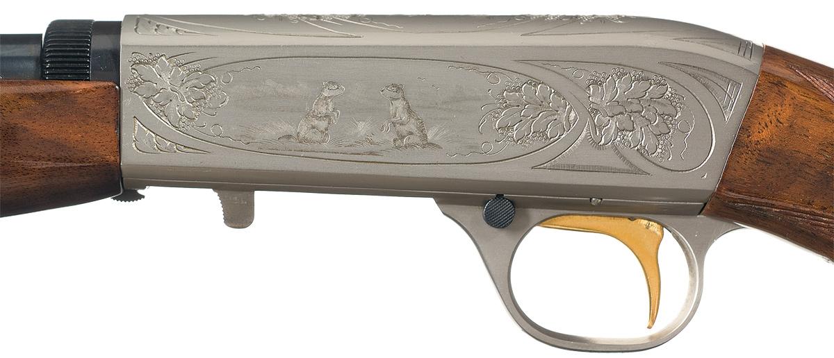 Manufactured in Belgium with bead blade front and adjustable folding leaf rear sight. French grayed receiver with Grade II floral and animal scene engraving: two prairie dogs on the left and two squirrels on the right, with a flying duck on top. Fancy high gloss checkered walnut forearm and pistol grip stock.