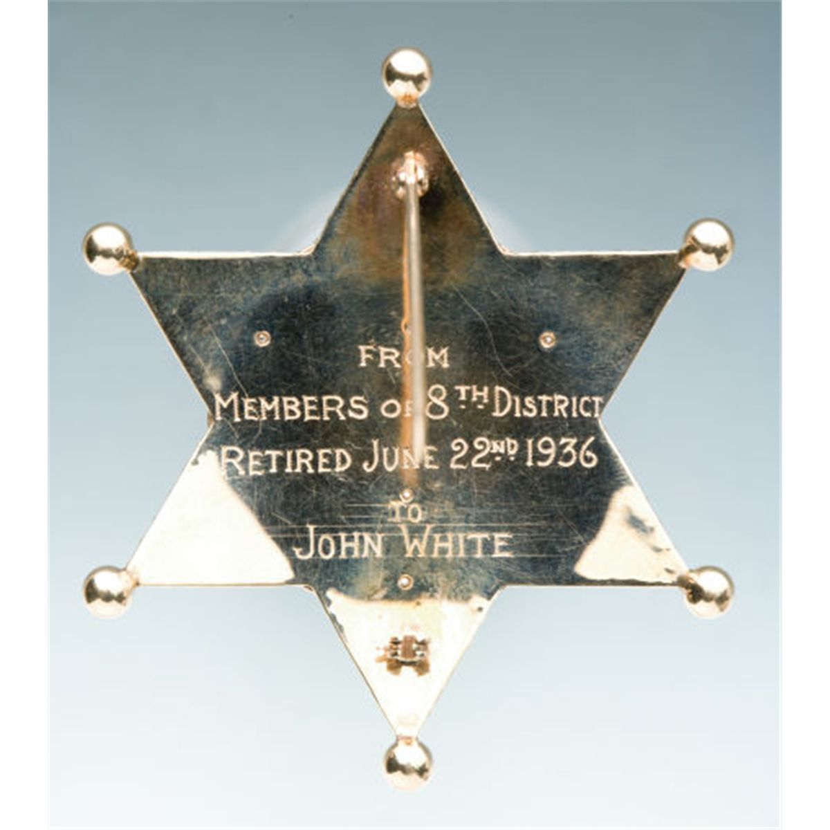 Excellent Engraved Gold and Enameled Six-Pointed Star Pattern Presentation Badge to John White, Badge No. 1820, Chicago Police Department. 2 5/8-inches tall. Finely engraved with raised seal in center and black enameled legend: Chicago Police/1820. Ball tipped star points. Reverse with presentation inscription reading: "From/Members of 8th District/Retired June 22nd, 1936/To/John White." Gold pin and safety catch.Condition: Excellent