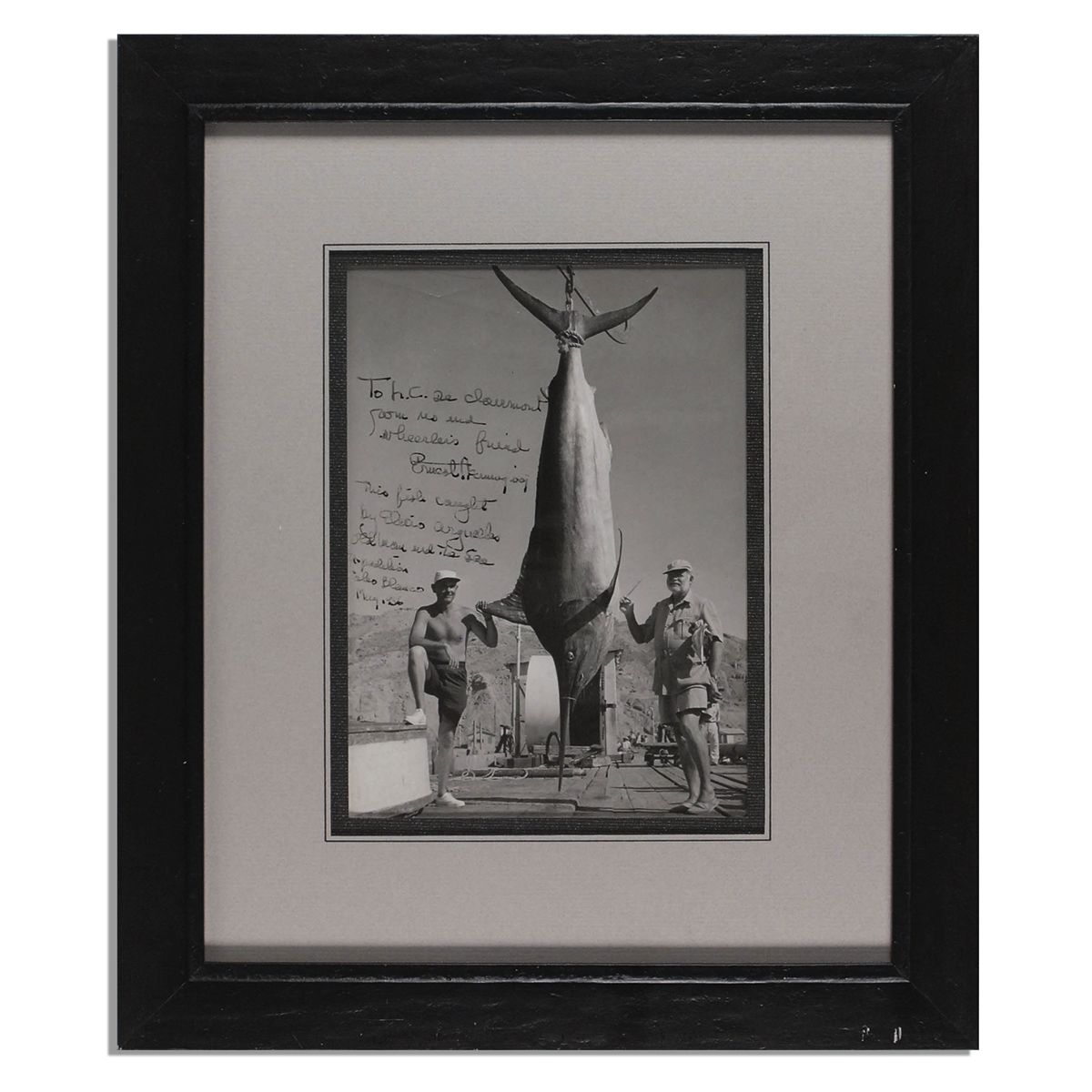Ernest Hemingway signed photo from the fishing expedition planned in honor of his book, ''The Old Man and the Sea''. Photo from the ''Old Man and the Sea Expedition'', held in Cabo Blanco in May 1956, depicts Hemingway posing with Elicio Arguelles and his catch: a gigantic marlin. Arguelles was a Cuban sportsman and friend who accompanied the author on many fishing expeditions. Full-length black-and-white photo is inscribed in black ink along left side, ''To L. C. De Clairmont / from his and / Wheerler's friend / Ernest Hemingway / This fish caught / by Elicio Arguelles / Old Man and the Sea / Expedition / Cabo Blanco / May 1956''. Cabo Blanco was known as ''Marlin Boulevard'' for the plentiful bounty of Marlin in its waters, located just of the northern coast of Peru. Hemingway spent April and May of 1956 with a film crew from Warner Brothers at Marlin Boulevard. Glossy photo measures 6.75'' x 9.25'' with some creasing and silvering, else near fine.