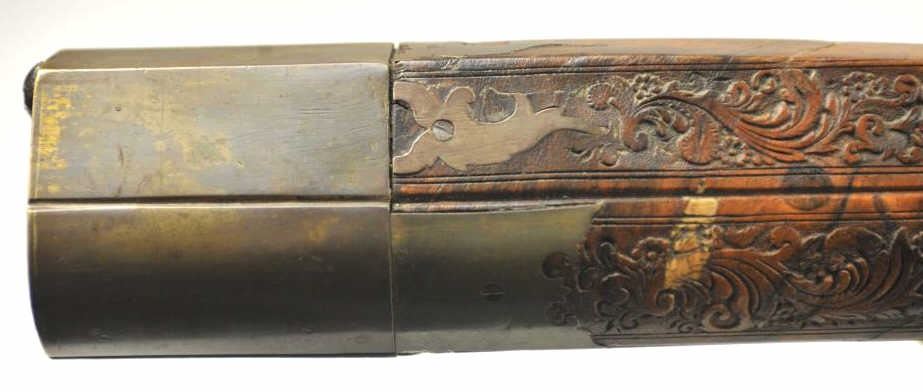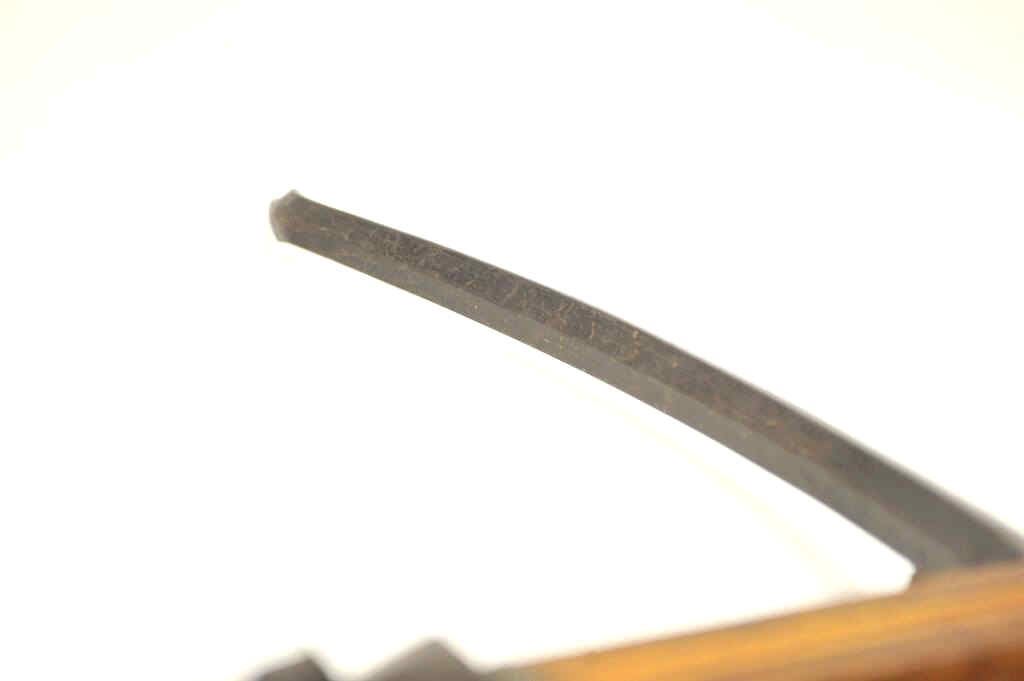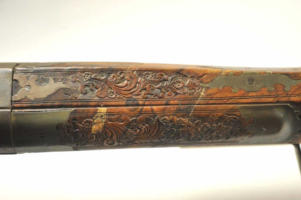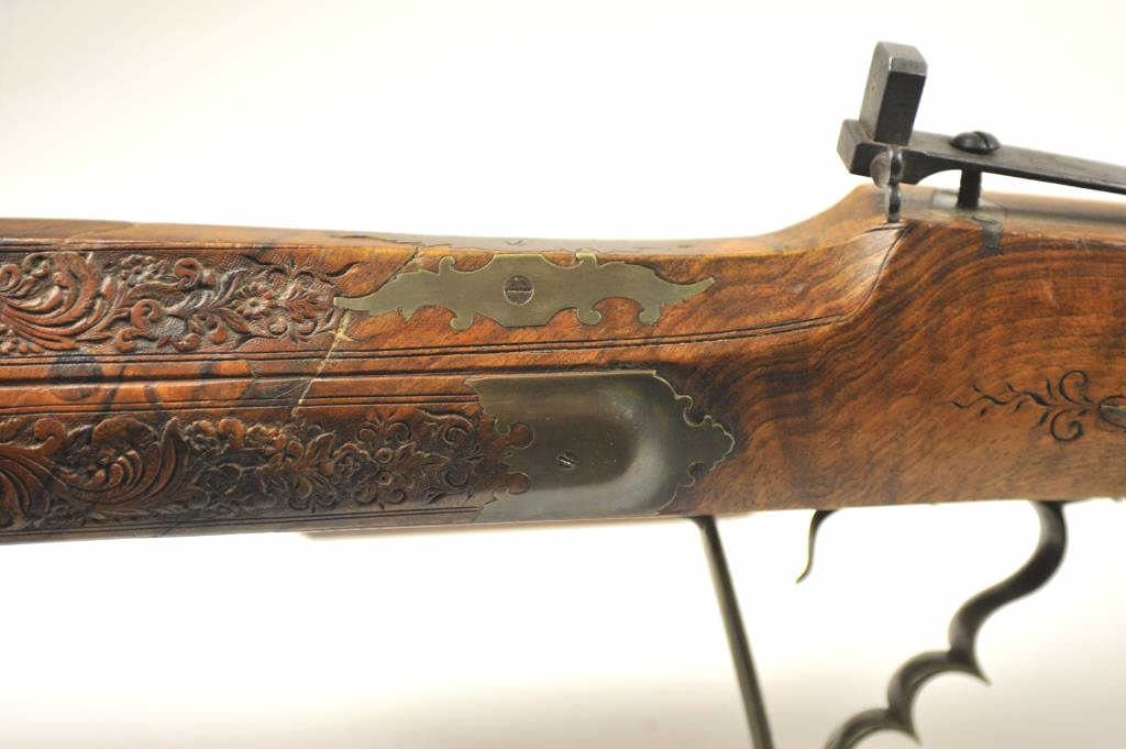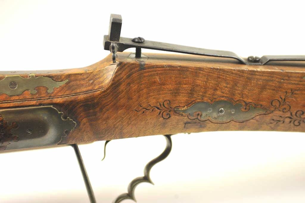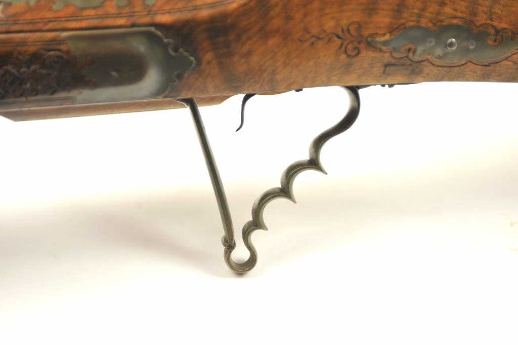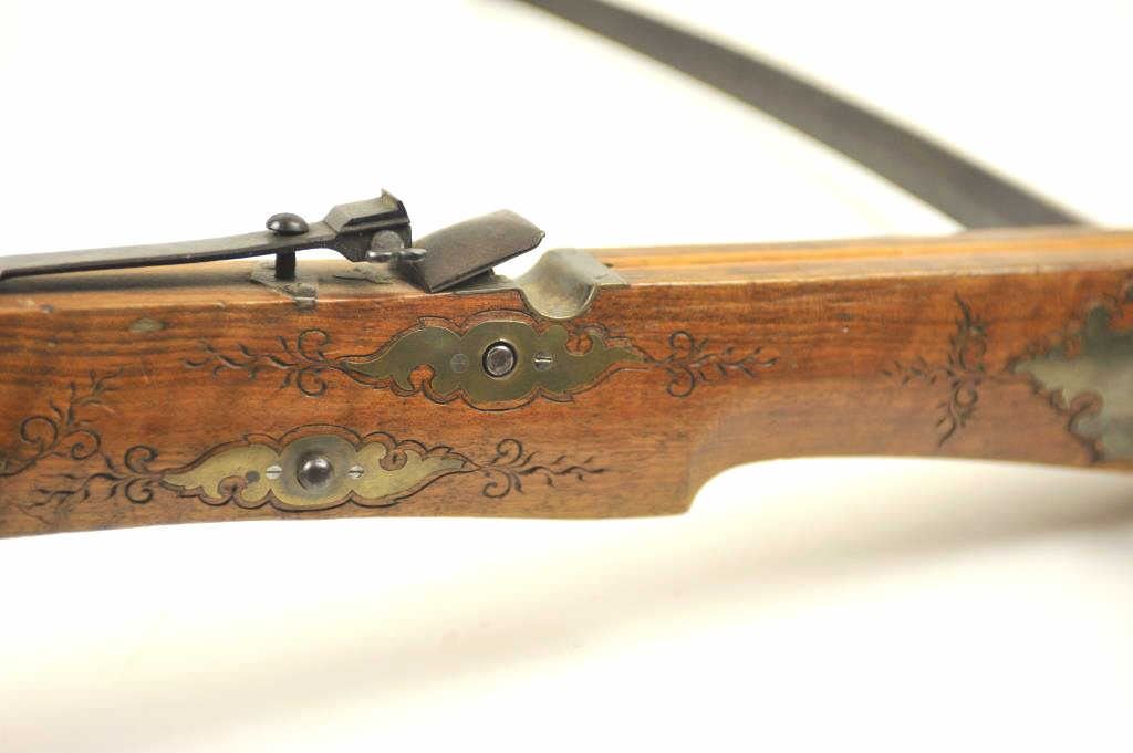 Excellent European crossbow with high quality carved stock. The butt stock shows a Wheelock style stocking with brass mountings and finger grooved guard. Thick curved iron bow needing goat’s foot or cranequin to cock. The bow measures 36 ½” across and 38” from tip to end. The metal work is quality and single set trigger. Good overall with old dowel repair to broken butt stock. Shades of “William Tell”. Est.: $1500-$3000