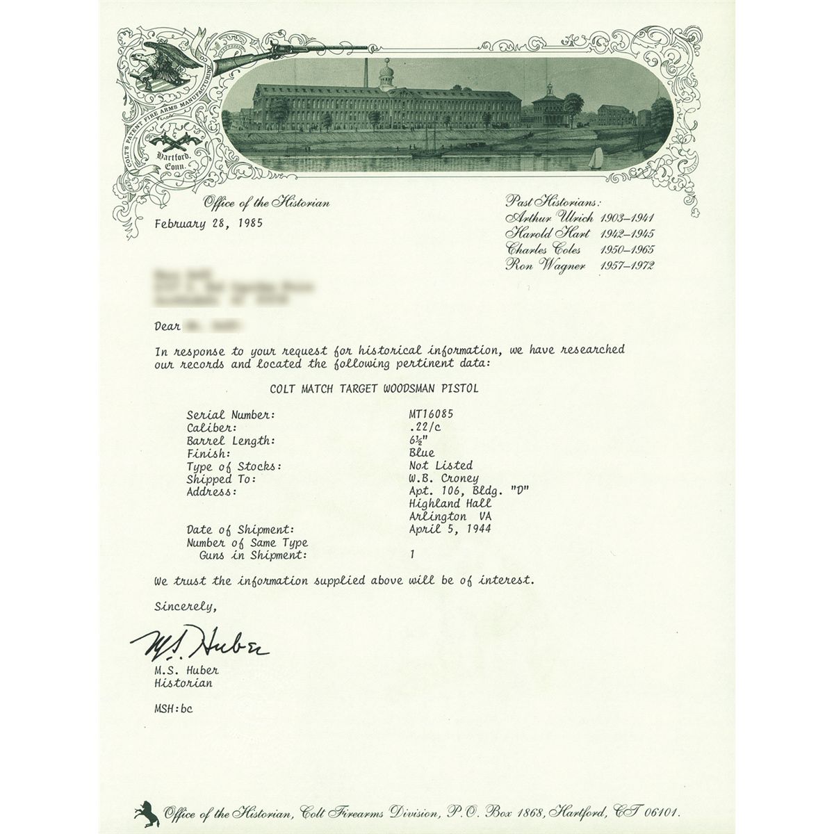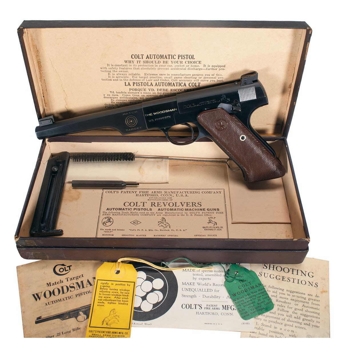 This is an example of 1 of only 3 Match Target pistols civilian sold during WWII. The pistol is U.S. marked, however was never shipped to the military, but a private citizen. The left rear of the barrel is marked "MATCH / target logo / TARGET", the left side of the frame is marked "THE WOODSMAN / U.S. PROPERTY" and the left side of the slide is marked "COLT AUTOMATIC / CAL..22 LONG RIFLE" followed by the Rampant Colt. The serial number is marked on the front strap and the upper front of the trigger guard is marked "e" over the Colt "VP" triangle proof, with "74" on the opposite. Pinned blade front and adjustable rear target sights, serrated trigger, blue colt marked magazine and fitted with checkered plastic extended grips with "COLT" over the Rampant Colt in a circle molded at the top. The accompanying factory letter verifies the serial number, caliber, 6 1/2" barrel, blue finish, grips as "Not Listed" and that it was shipped as 1 to an individual in Arlington, Va. On April 5, 1944. The pistol is complete with the original maroon hinged lid box numbered to the gun, manual, "Special Instructions" and "Shooting Suggestions" pamphlets, Woodsman and rear sight hanging tags, cleaning brush, waxed paper, and rear sight screwdriver.