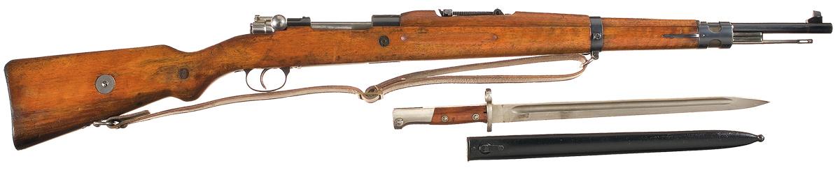 Condition: Very fine, with 95% of the original blue finish, showing areas of brown and gray patina, bright edge wear and minor handling marks. Stock is fine as German modified, with the sling swivel removed and plugged with a wood dowel in the pistol grip area and scratches and pressure dents. Bayonet is good very fine. Mechanically excellent.