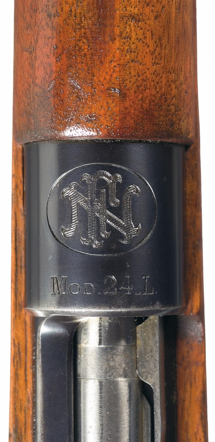 Produced in Belgium, and showing signs of capture by the Germans. Blade and tangent sights, with the FN crest on top of the receiver ring above "Mod.24_L" and the address on the left side wall. Milled components. Smooth straight grip stock with an unmarked unit disc, brown leather sling and a flat buttplate. With an unmarked bayonet, 15" single fuller blade, smooth grips and a metal sheath.