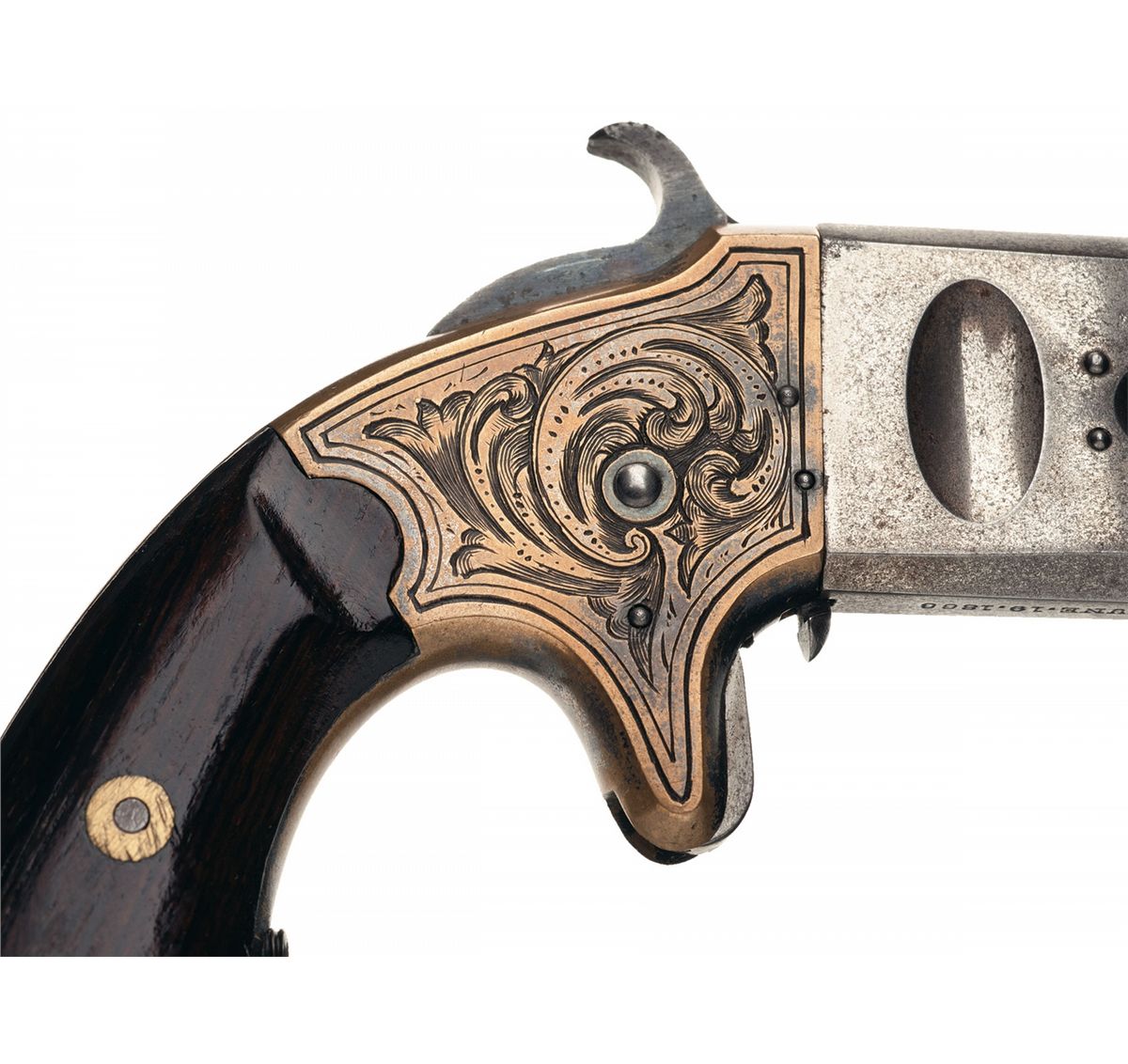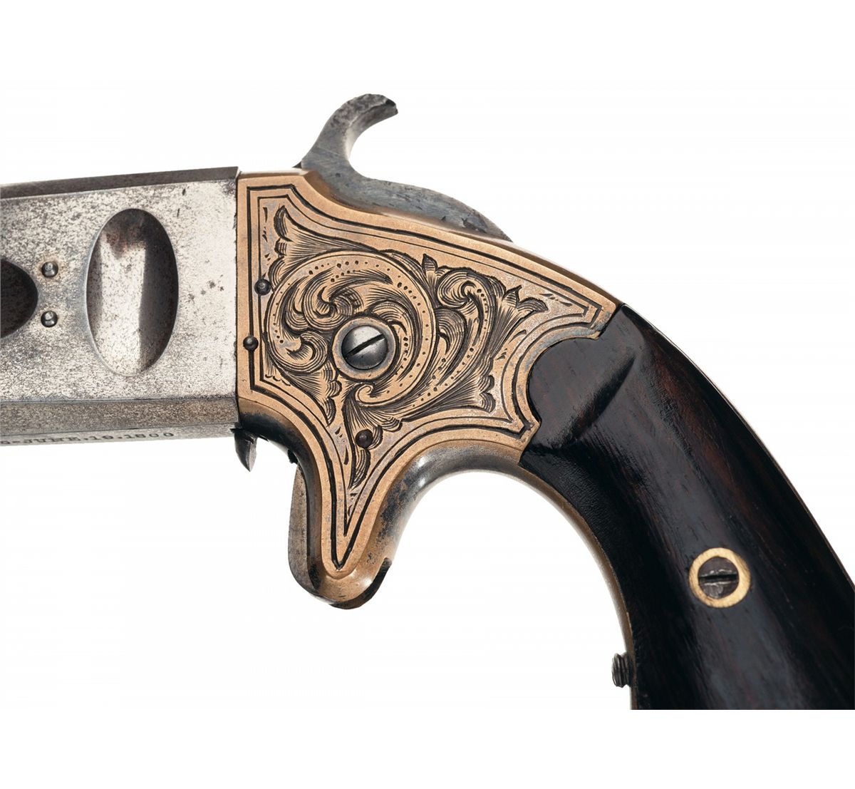 These double barrel deringers or "pocket pistols" were manufactured by the American Arms Co. of Boston, Mass. from 1866 to 1878 with a total production of under 5,000. Dual calibers of 32 over 22 RF. Silver plated brass frame with nickel barrels, one marked "AMERICAN ARMS CO. BOSTON MASS.", the other "WHEELER'S PATENT OCT.31, 1865 - JUNE 19, 1866". The superposed barrels rotate for loading and firing. Both side plates have been factory engraved in fine scroll and border design with a simple splash on the grip strap. Spur trigger, knurled hammer and smooth rosewood grips on a square butt.