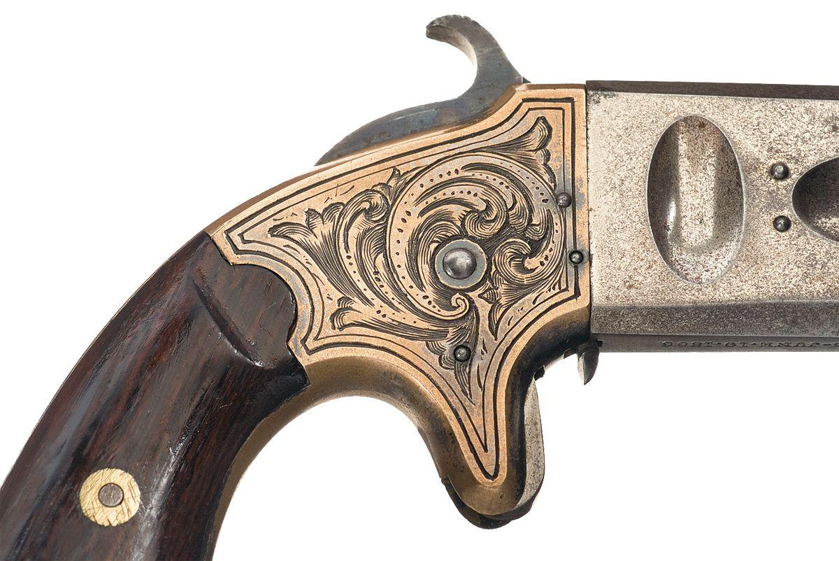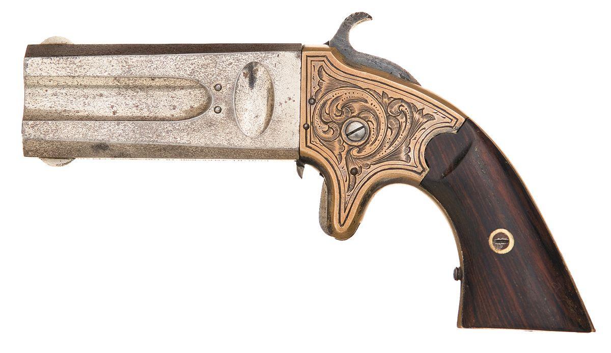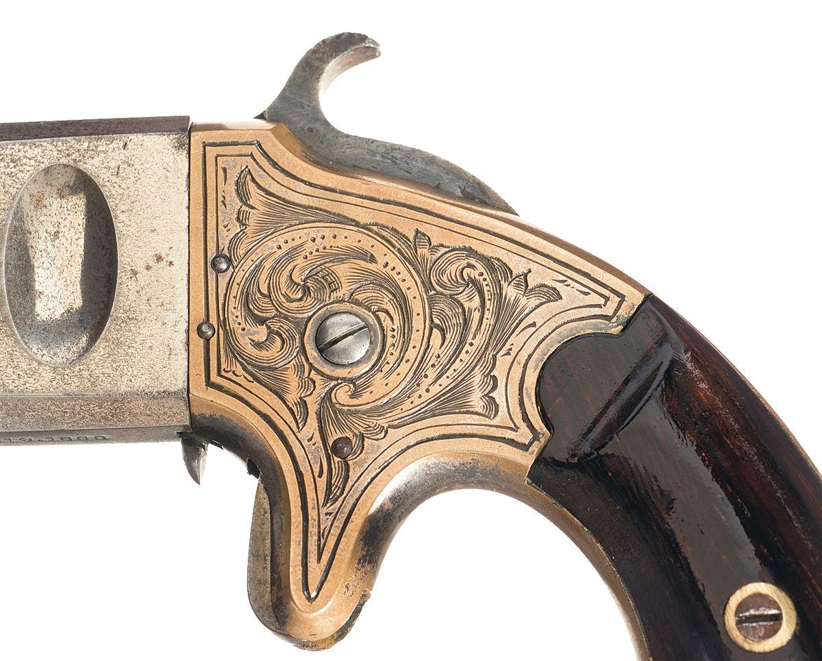 These double barrel deringers or "pocket pistols" were manufactured by the American Arms Co. of Boston, Mass.. From 1866 to 1878 with a total production of under 5,000. Dual calibers of 32 over 22 RF. Silver plated brass frame with nickel barrels, one marked "AMERICAN ARMS CO. BOSTON MASS.", the other "WHEELER'S PATENT OCT.31 1865 - JUNE 19, 1866". The superposed barrels rotate for loading and firing. Both side plates have been factory engraved in fine scroll and border design with a simple splash on the grip strap. Spur trigger, knurled hammer and smooth rosewood grips on a square butt.