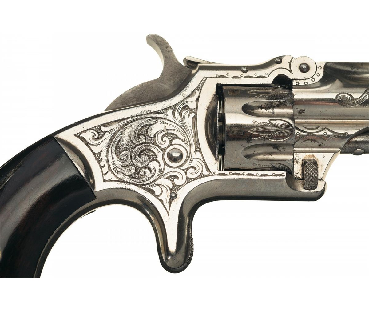 Manufactured from 1868 to 1881 with this example featuring a New York style engraving. The sides of the barrel and frame feature a scrollwork on a punch dot background. The sides of the barrel lug are engraved with a wire and dot pattern. The cylinder flats have a floral pattern engraving and the back strap has an engraved starburst at the top followed by a wire and dot motif down the length of the back strap. The top of the barrel rib is marked with the one line address and patent dates. The assembly number "17" is stamped on the frame (left side under the grip), barrel and cylinder. Fitted with nicely figured rosewood bird head grips.