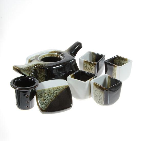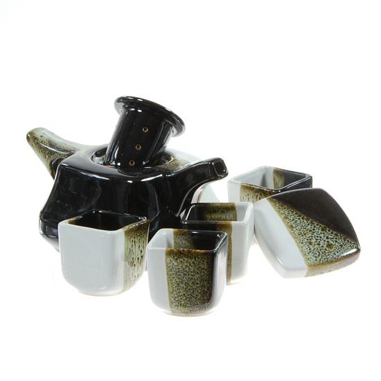 Well crafted multi-color set; pot plus four cups and base; pot 8"