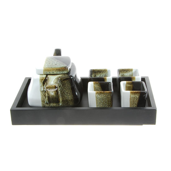 Well crafted multi-color set; pot plus four cups and base; pot 8"