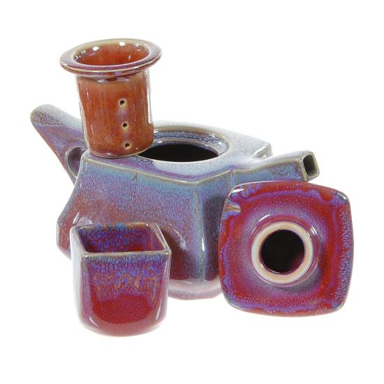Well crafted multi-color set; pot plus four cups and base; pot 8"
