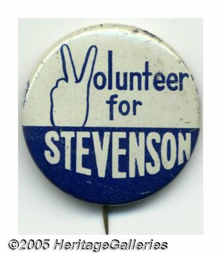<B>Excellent Grouping of Adlai Stevenson Pinbacks</B></I> Stevenson was a popular, reform-minded Illinois governor when he was drafted by the Democratic party to run against Eisenhower in the 1952 election. He ran an eloquent campaign but was soundly defeated not only in 1952 but also in 1956. In 1960, he reluctantly campaigned for the nomination which he lost to Kennedy. Here are ten different campaign pinbacks ranging in size from 1.25" to 1.75" in diameter, both tin lithos and celluloids included. In excellent collection. Lot:264