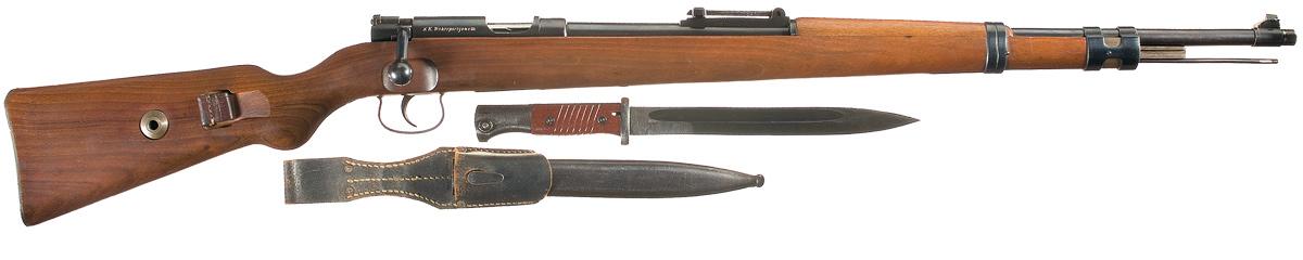 Blade and tangent sights, with caliber marking on barrel, "eagle/ N" on the barrel and receiver, and the maker and model markings on the receiver. Smooth stock with a brown leather sling and flat buttplate. With a small caliber target rifle badge (Tyrolean in origin) secured to the sling and a WKC marked Weyersberg (Solingen) bayonet, dated 45, 10" blade, ribbed grips, metal sheath and leather frog.
