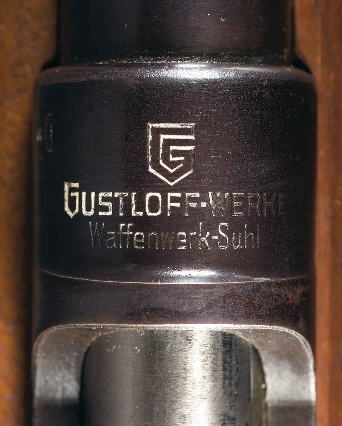 Condition: Excellent, with 98% plus of the original blue finish, showing bright wear on the muzzle, areas of brown patina on the barrel and scattered handling marks and spotting. Stock is excellent, with mild scratches and dings. Badge is fine, leather has some scuffs and cracks, and the bayonet is excellent. Mechanically excellent.
