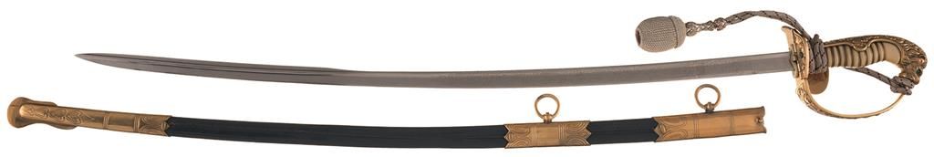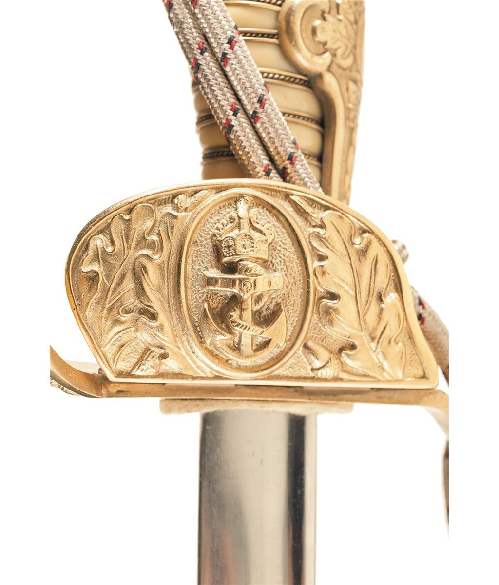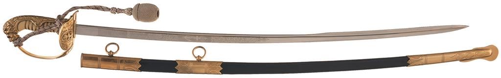 Measuring 35 inches overall, the 29 3/4 inch blade is etched on both sides with floral vine work, scenes of ships at sea, a crowned anchor and arrays of tridents, oars and billhooks. No makers marks are present. Gilt finished hilt, with folding guards, sculpted oak leaf and acorn designs, gilt wire wrapped white celluloid grip, silver portapee and acorn with red and black accents and a lion head pommel with green and red stone eyes. With a gilt brass fitted black leather sheath, with a retention post compatible with the folding counter-guard on the sword..