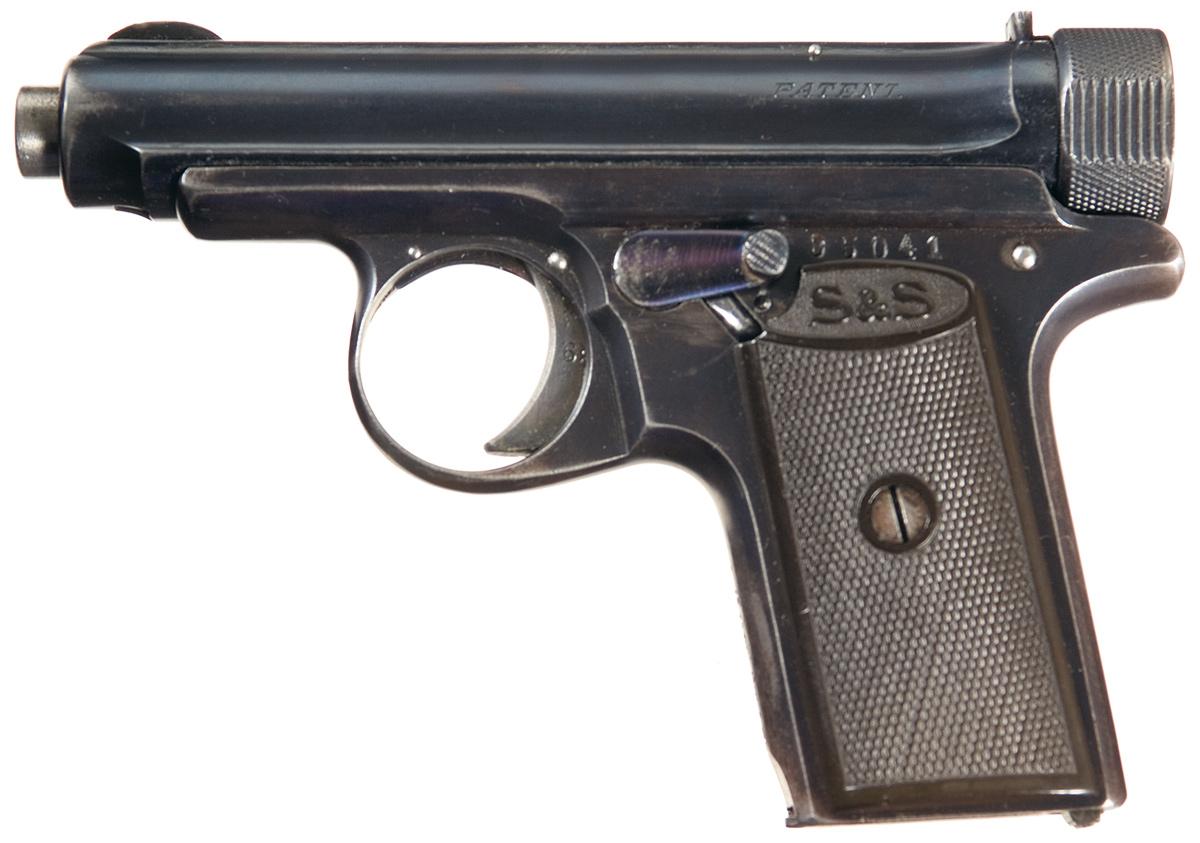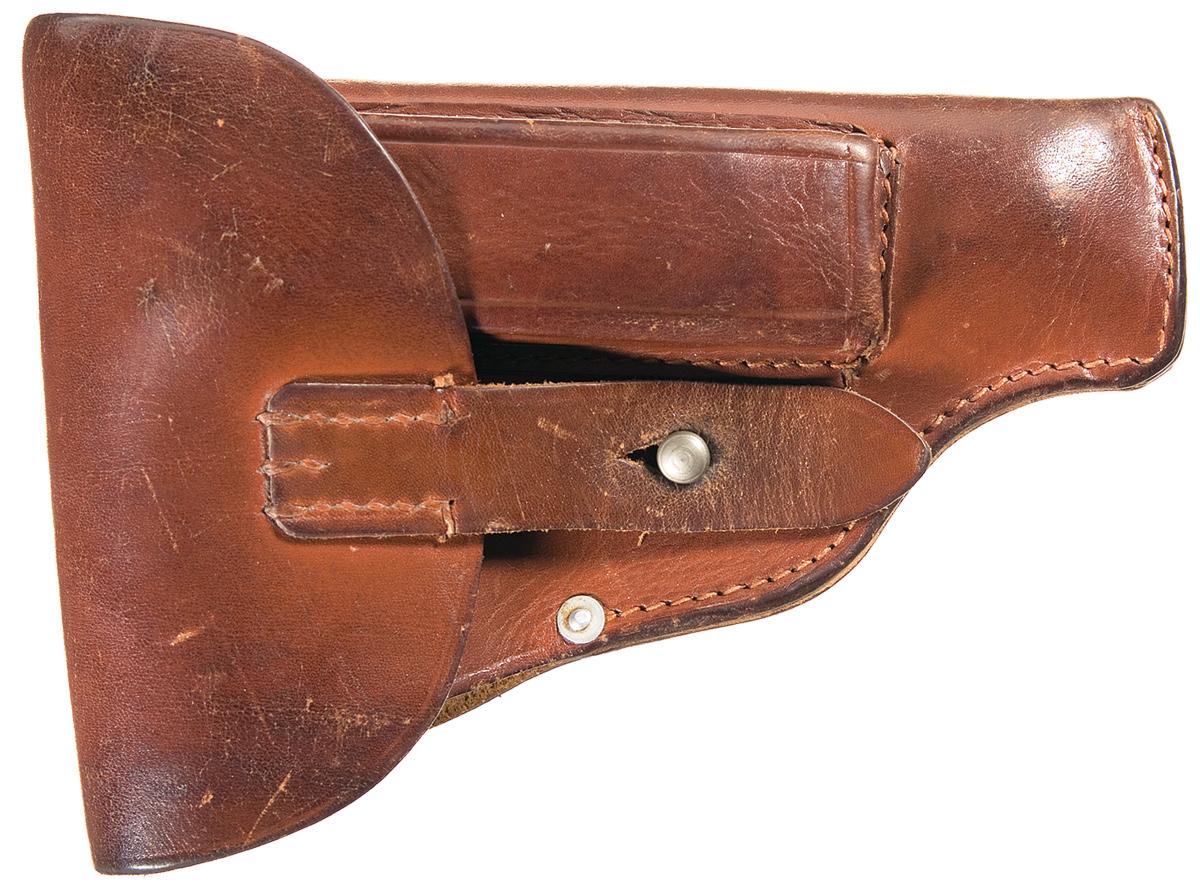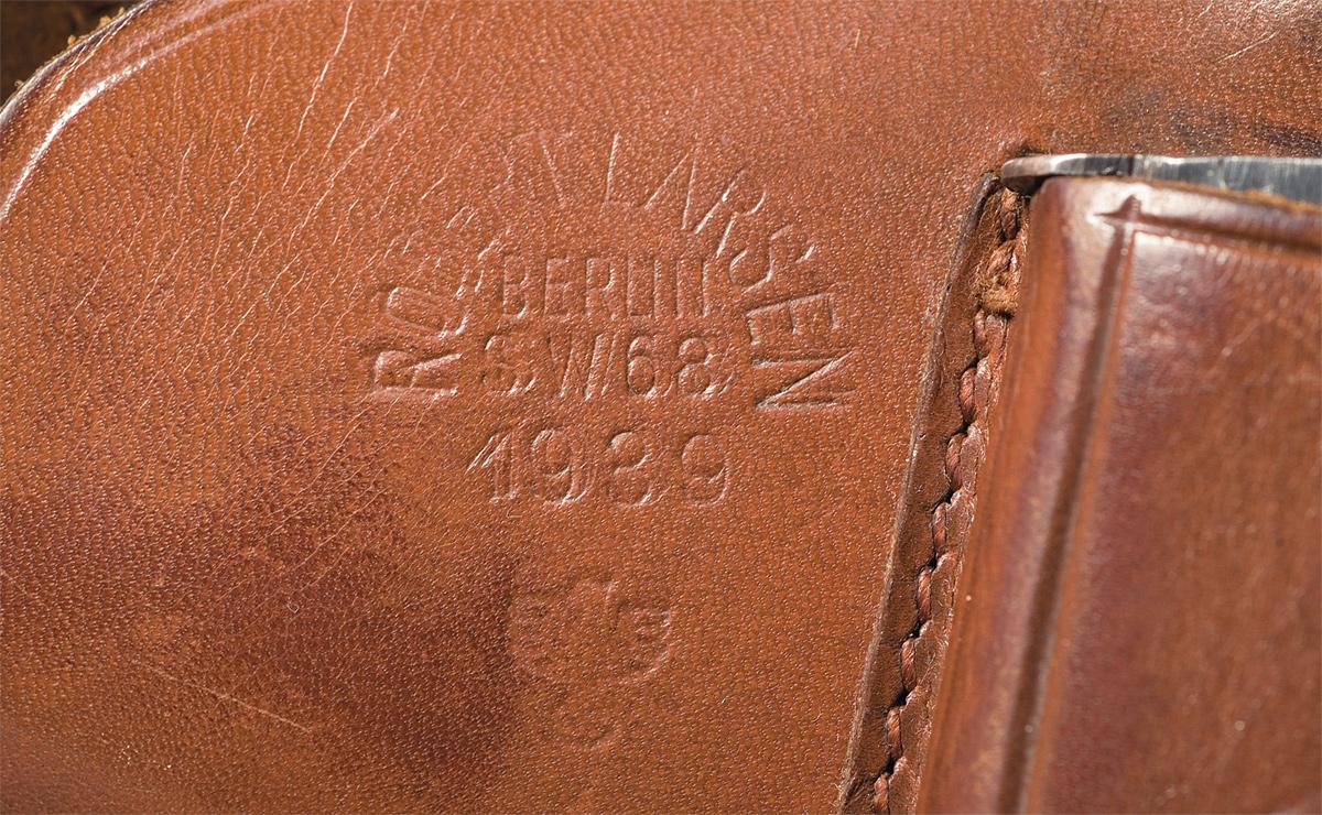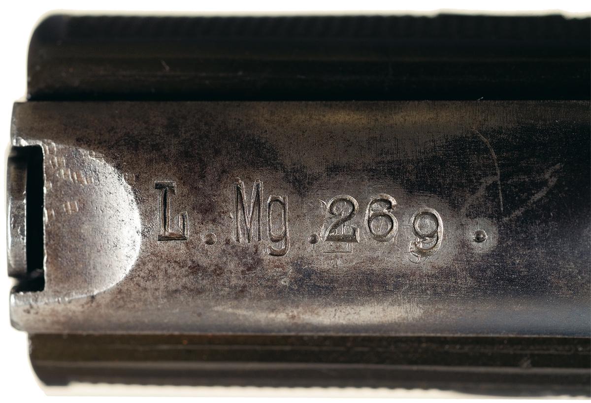 Fixed sights, slide lock inside trigger guard, and Sauer address atop slide in front of the Suhl knight. Left side of slide marked "PATENT" and the right side marked "CAL. 7.65". "Crown/N" proof on rear of cocking knob, right side of frame and barrel. The front grip strap has a Prussian State Police marking: "L.Mg.269" (Landjagerei Magdebrug Gun No. 269). S&S logo in oval at top of checkered grips. Comes with two magazines numbered to the gun. Complete with a brown leather holster with "ROBERT LARSEN / BERLIN / SW/68 / 1939" stamped on front, the gun serial number (85041) stamped on the back, and a three line U.S. GI inscription on the inside of the flap ("Clinton L. Gerry / 31472296 / Co F 67th Arm'd Reg").