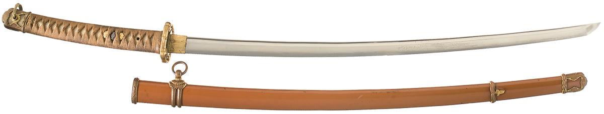 Blade is 27 1/2" long, with single hi, wavy hamon, and gold washed copper habaki. Military tsuba, with silver and brass seppa, properly pierced to accept the sheath retainer clip in the fuchi. Military hilt, with brown cord wrap and military menuki with silver moon designs in the centers. The nakago is signed, with 5 symbols on the left side and three larger symbols on the right. Brown lacquered military saya, with single suspension band.