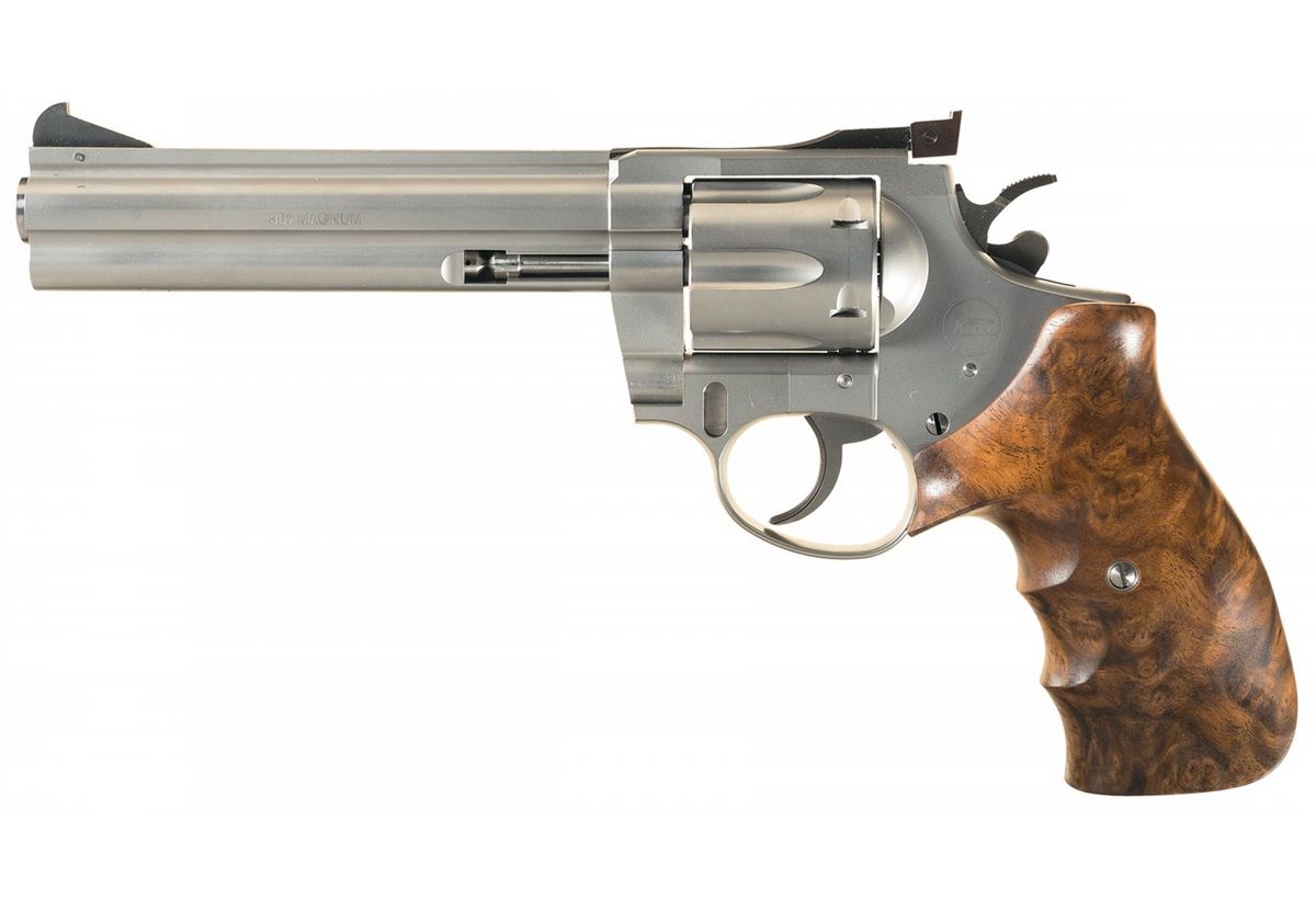 Dated "85" on the barrel, the products of Korth are considered to be the top revolvers made in Germany, showing a level of fit and finish that outshines all it's rivals on the continent and can stand toe-to-toe with top of the line American custom product. Blade front and adjustable rear sights, with ".357 MAGNUM" on the left side of the barrel, the "KORTH" logo on the left side of the frame and 3-line Ratzeburg address on the right. Matching numbers are present on the frame, crane, cylinder and ejector, with a quick-release takedown button on the right side of the frame and an ambidextrous cylinder release mounted alongside the hammer. Fitted with an attractively contoured burl walnut ambidextrous 3-finger grip.