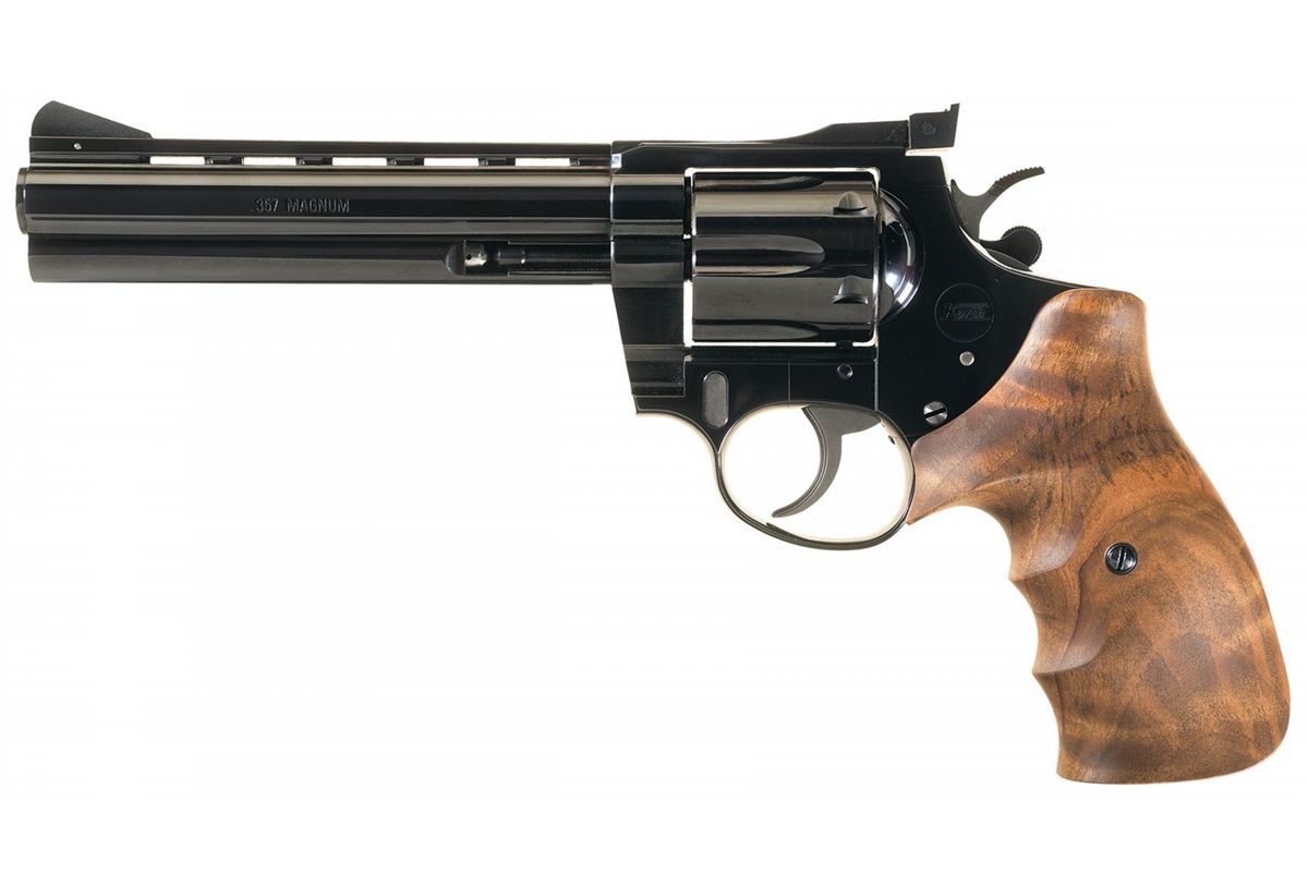 Dated "84" on the barrel, the products of Korth are considered to be the top revolvers made in Germany, showing a level of fit and finish that outshines all its rivals on the continent and can stand toe-to-toe with top of the line American custom product. Blade front and adjustable rear sights, with ".357 MAGNUM" on the left side of the barrel, "BEEMAN PRECISION ARMS/SAN RAFAEL, CALIFORNIA 94903" on the right, the "KORTH" logo on the left side of the frame and 3-line Ratzeburg address on the right. Matching numbers are present on the frame, crane, cylinder and ejector, with a quick-release takedown button on the right side of the frame and an ambidextrous cylinder release mounted alongside the hammer. Fitted with an attractively contoured ambidextrous 3-finger grip.