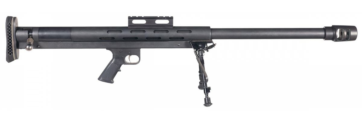 Measuring 45 1/2 inches overall, the LAR Grizzly Big Boar is one of the most compact 50 BMG rifles on the market, using a bullpup configuration to keep overall length down and heavy metal construction to help manage recoil. Manufactured without sights, with a 5 7/8 inch elevated rail and a 2-vent muzzle brake. The receiver tube is ventilated and is fitted with an AR-15 pattern grip, trigger and safety group. It has a spring-loaded folding bipod on the front with reinforcing cotter pins, and a combination bolt assembly and buttplate with a 1 inch thick vented Pachmayr White Line recoil pad. With a Gun Guard brand hard case and manual.